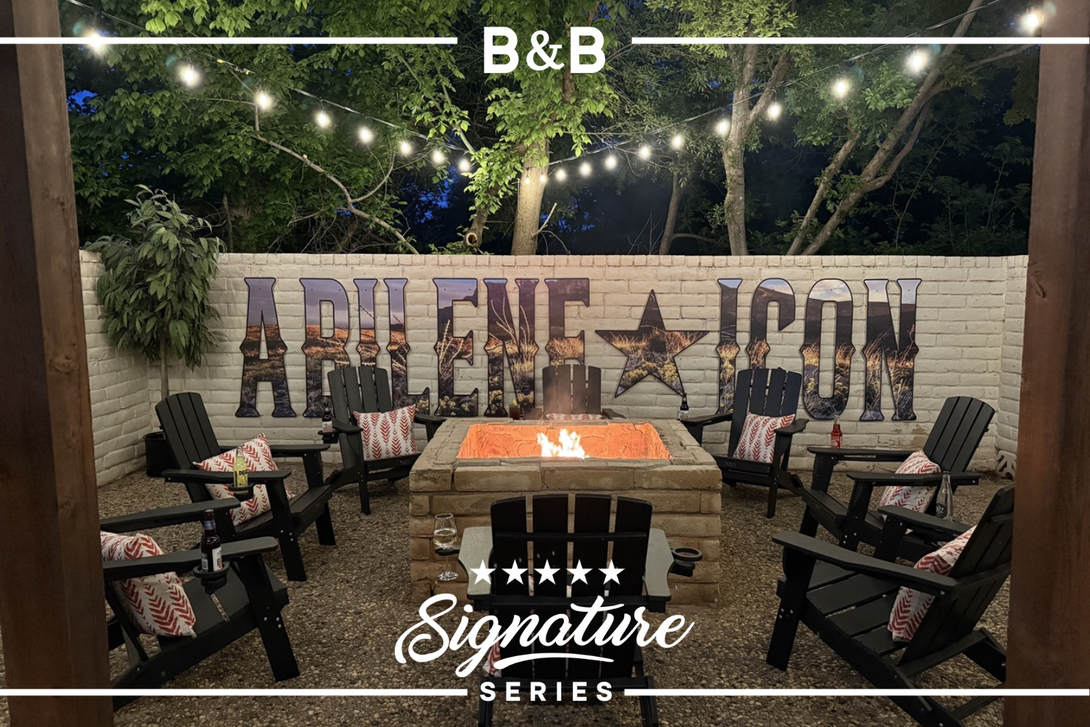 Out back, gather 'round the campfire where the Abilene Icon mural stands tall against the rustic brick wall. As twilight falls and the string lights twinkle like stars in the Texas sky, swap tall tales or toast a marshmallow while the embers glow. Whether firing up the grill irons or settling into the comfy chairs, this outdoor territory invites you to drink in that sweet Texas evening air.