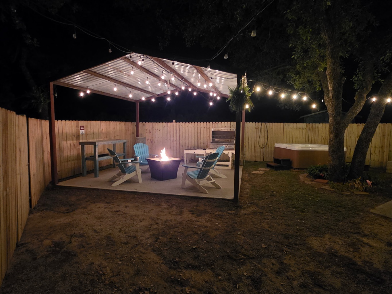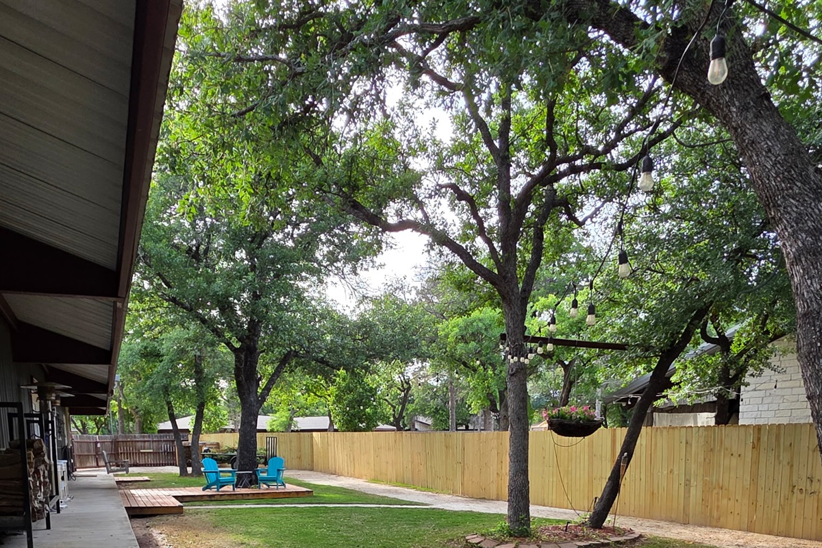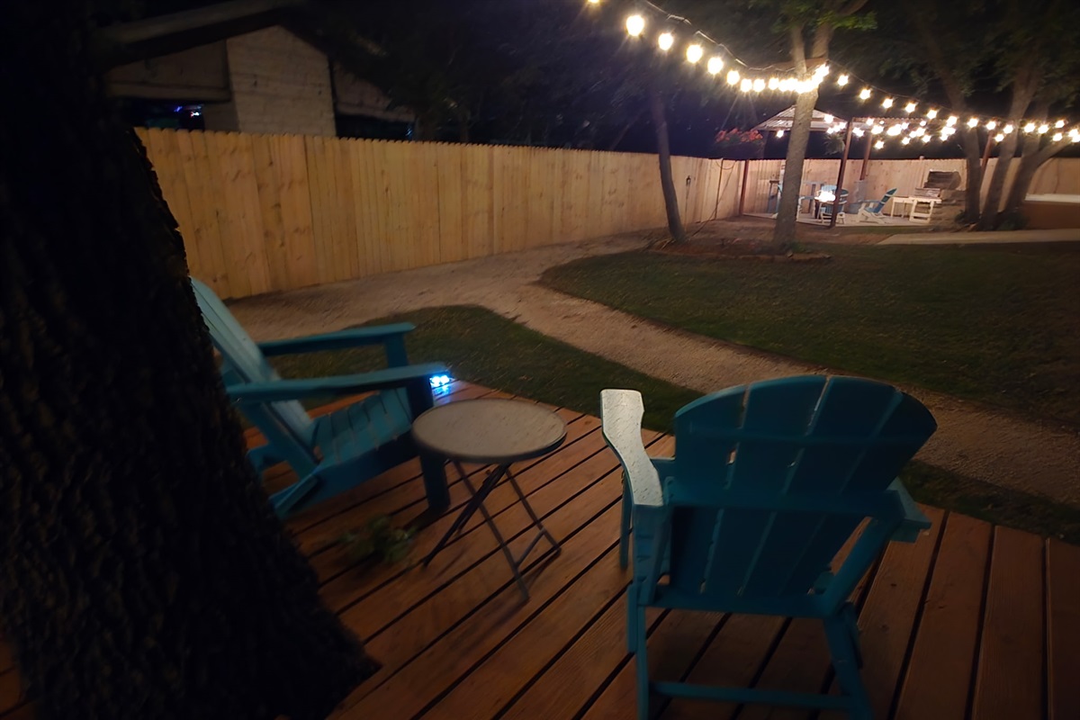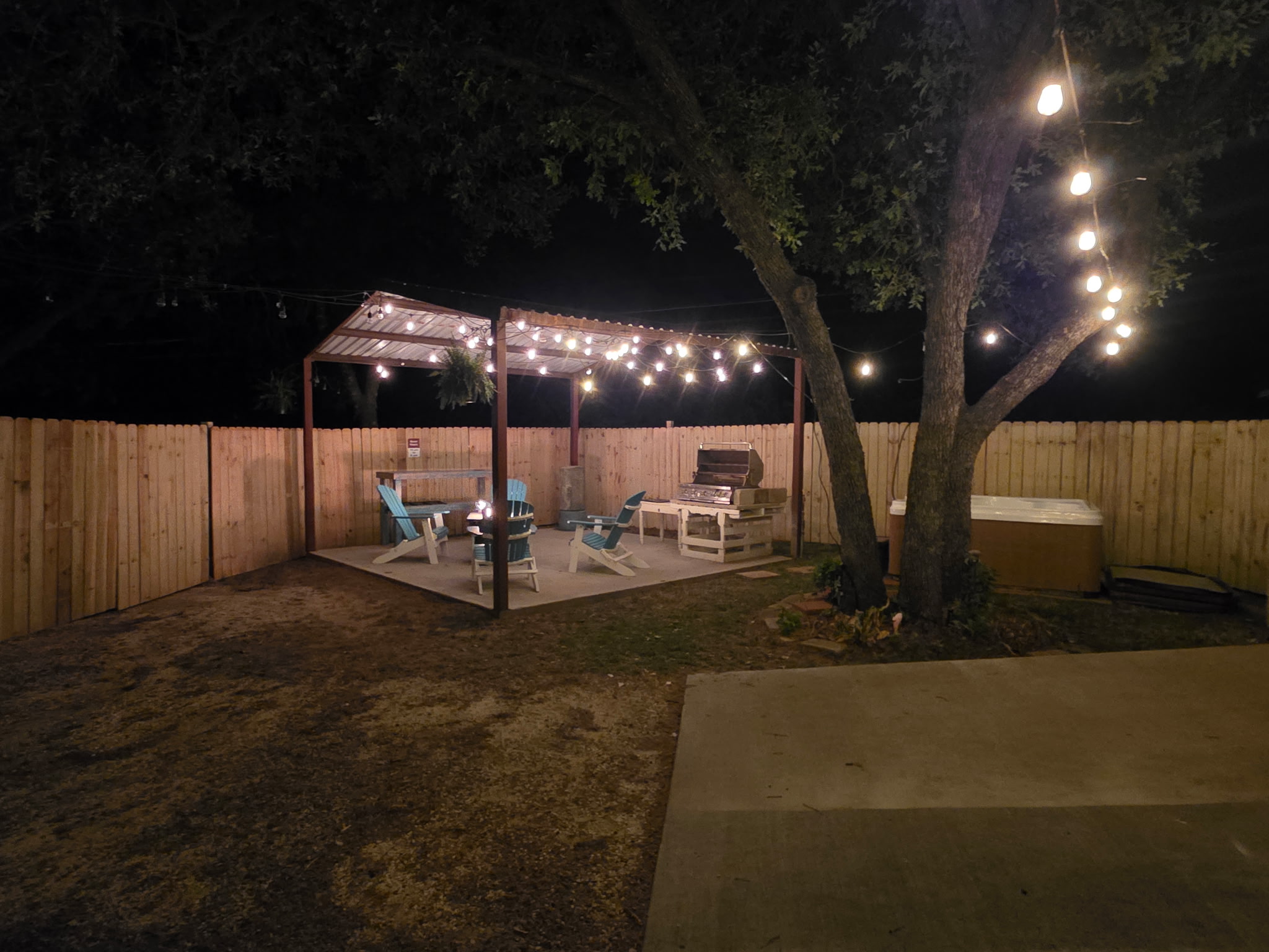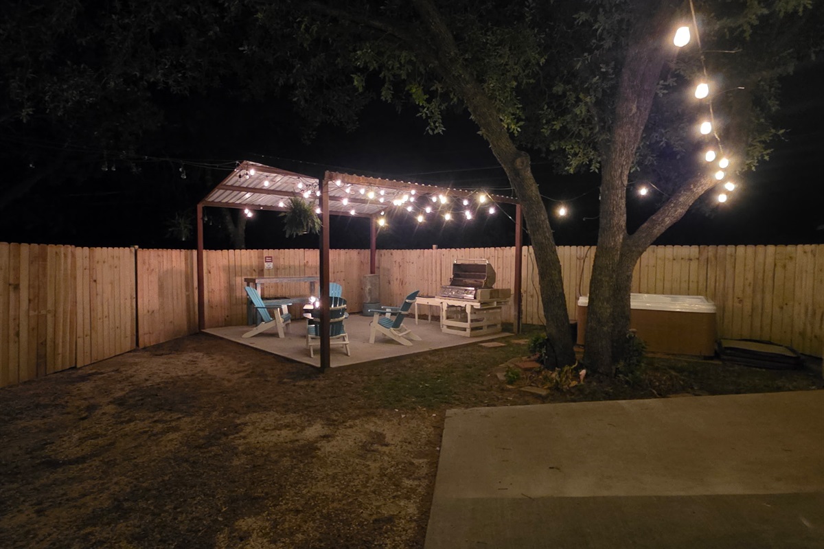 Outdoor Lighting: Extensive string lighting throughout courtyard