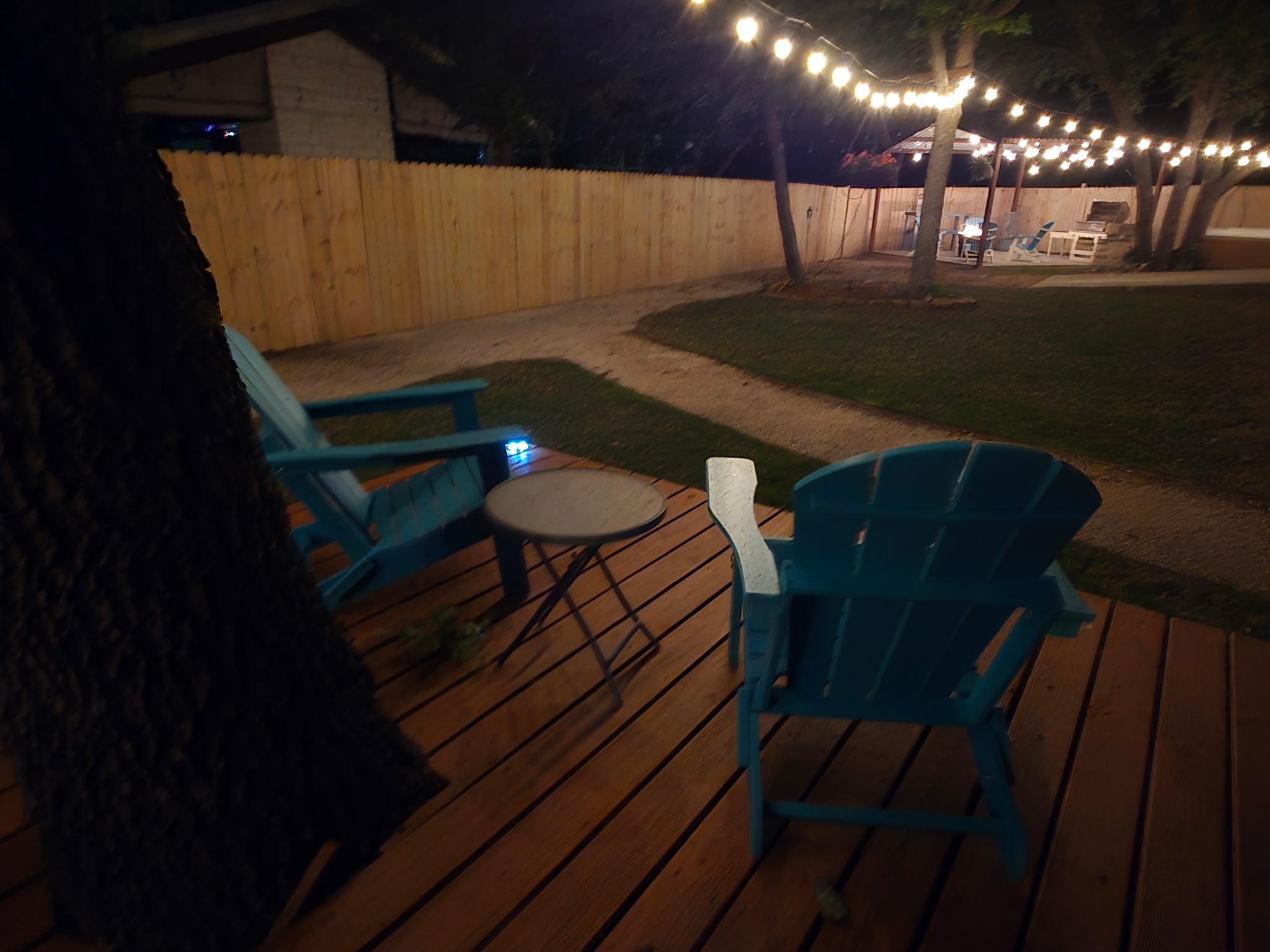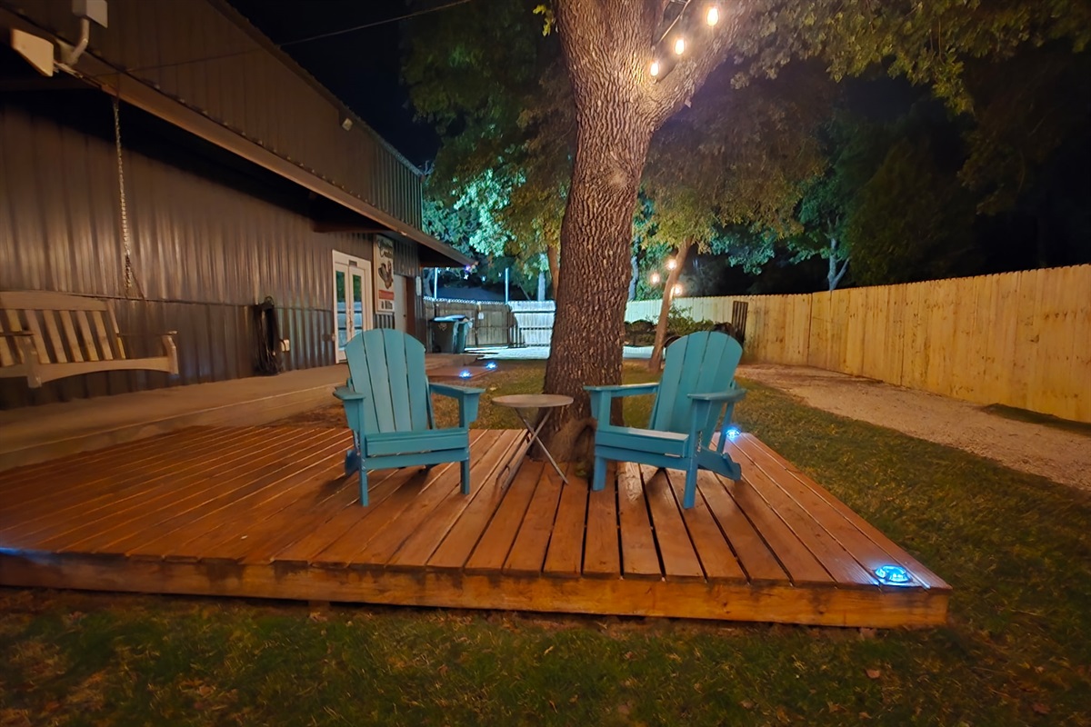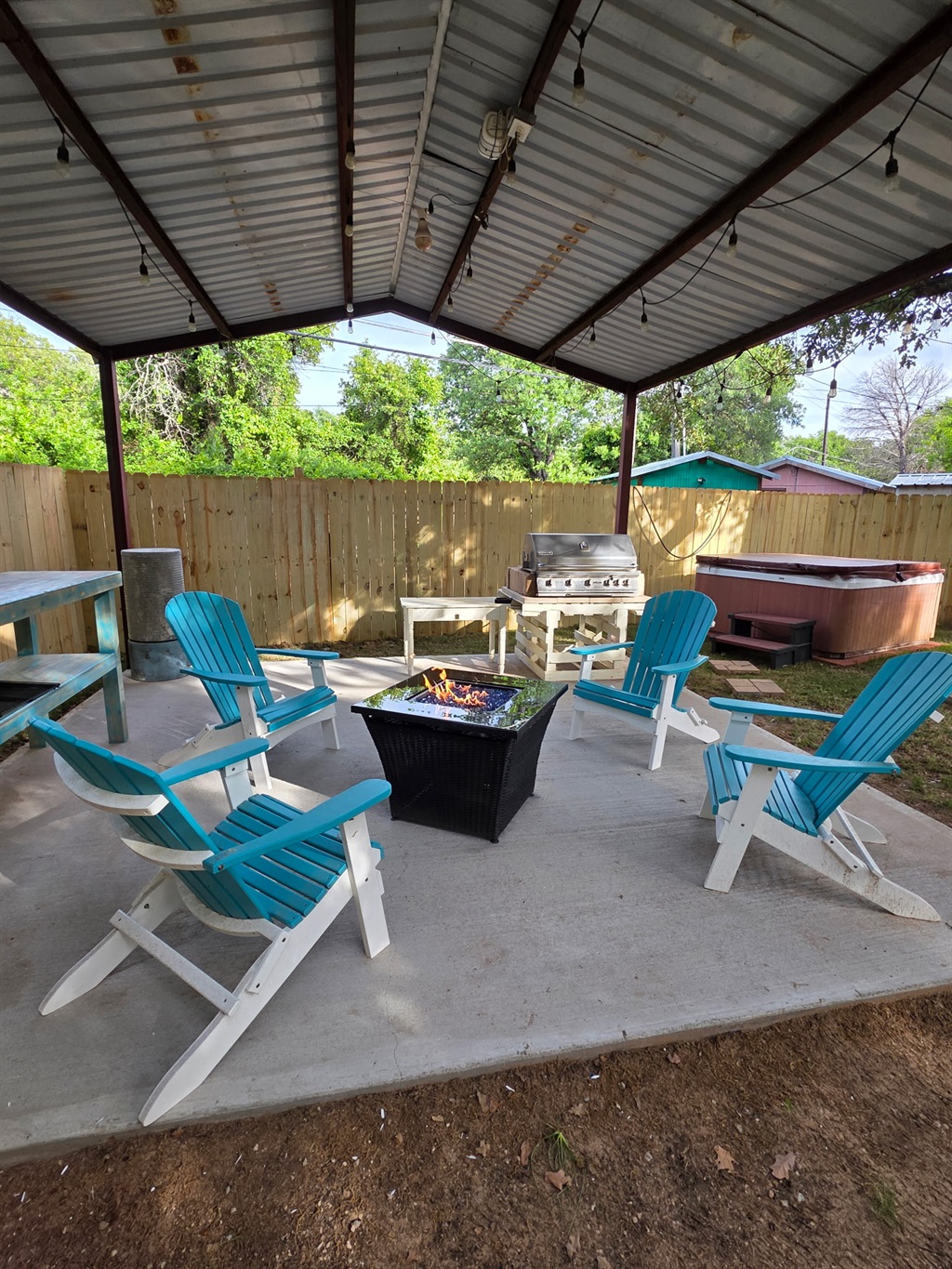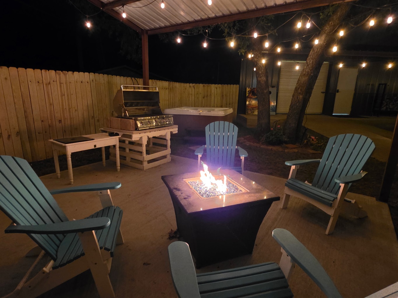 Outdoor Lighting: Extensive string lighting throughout courtyard