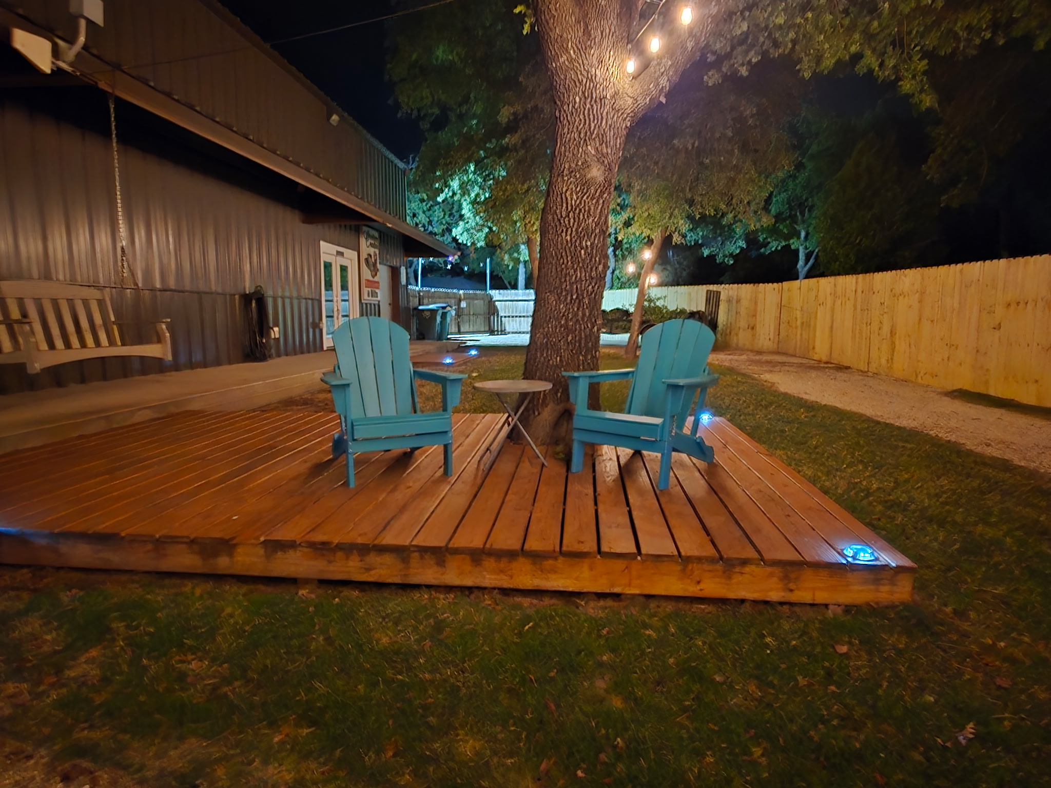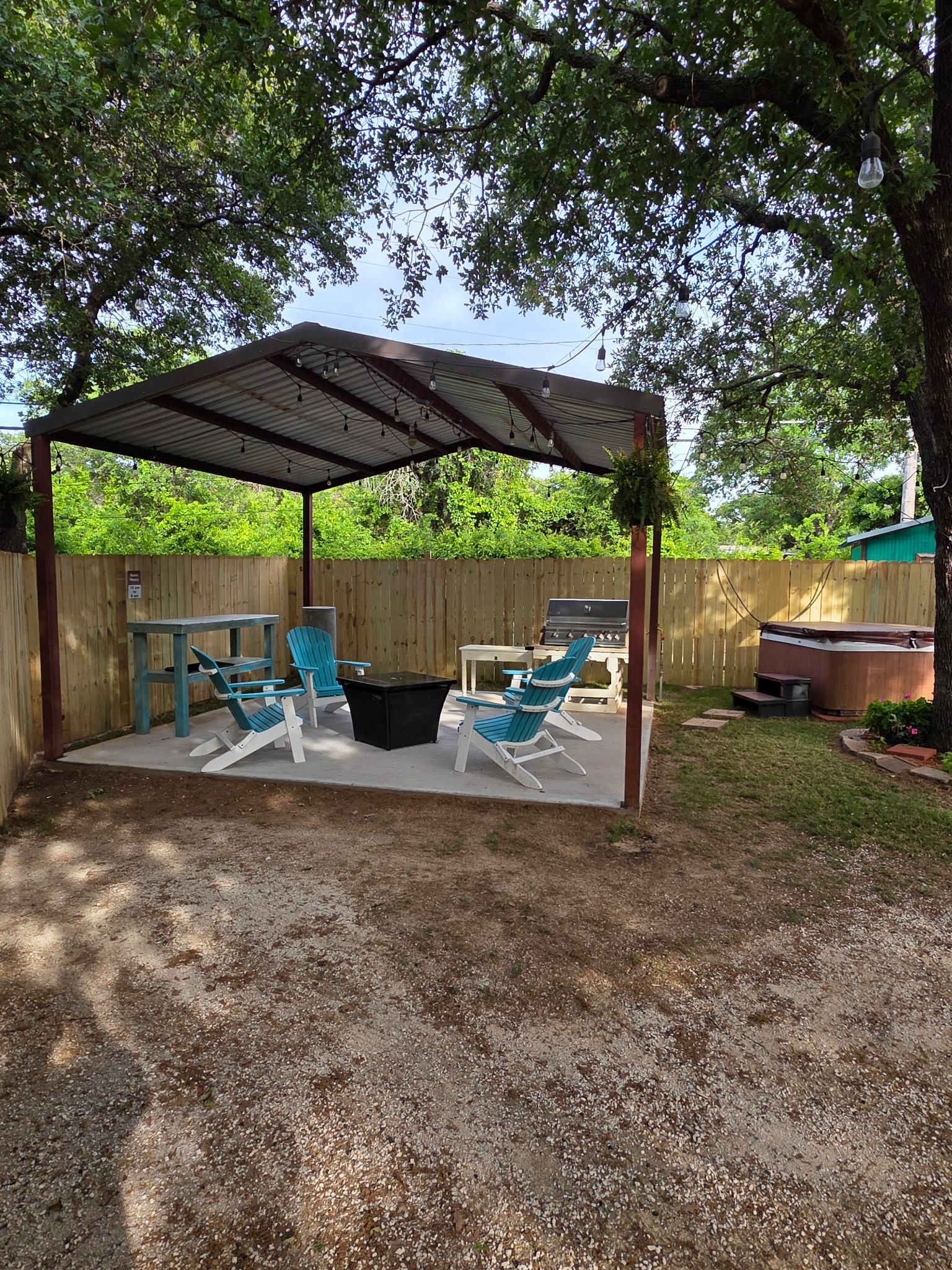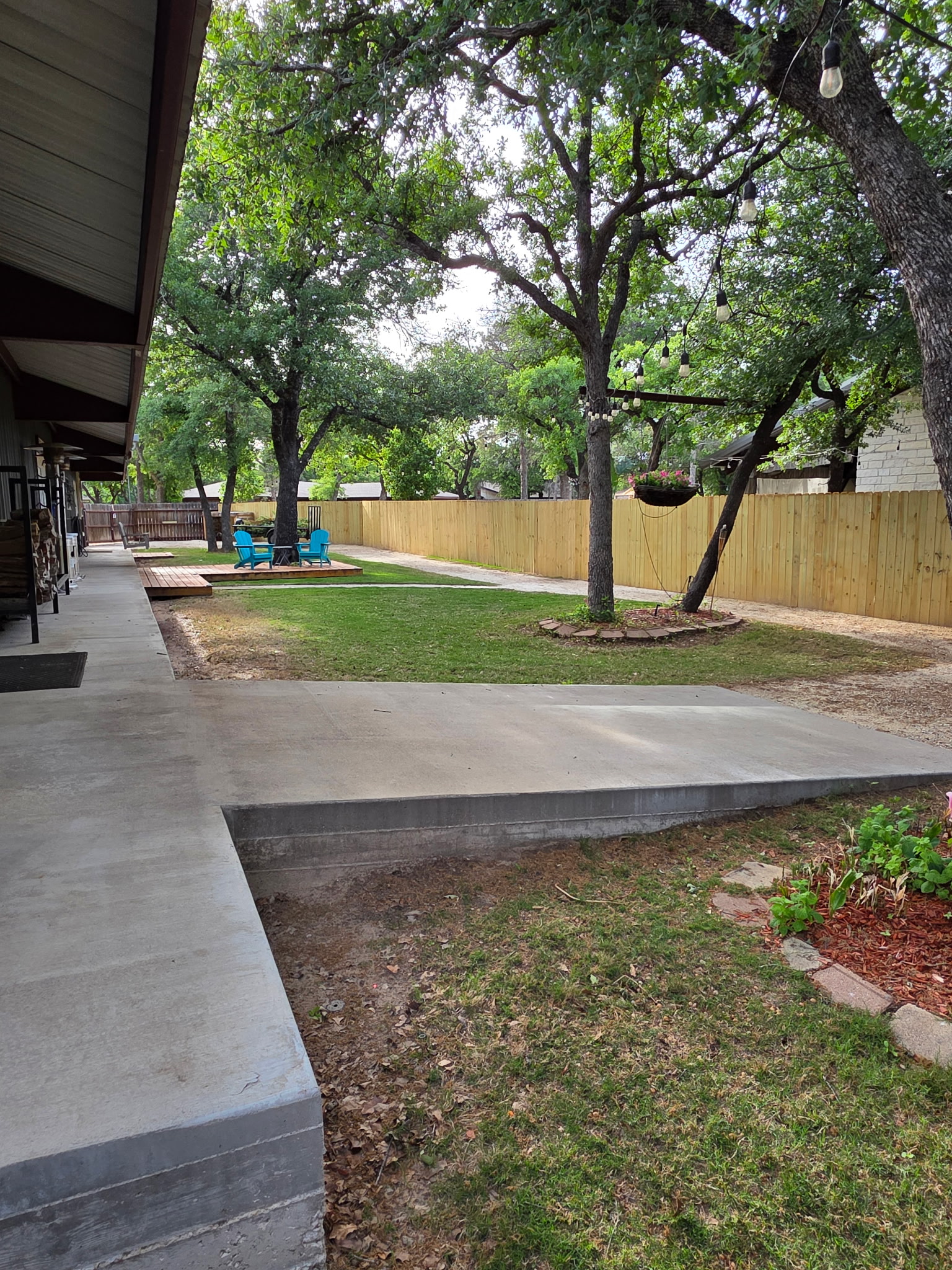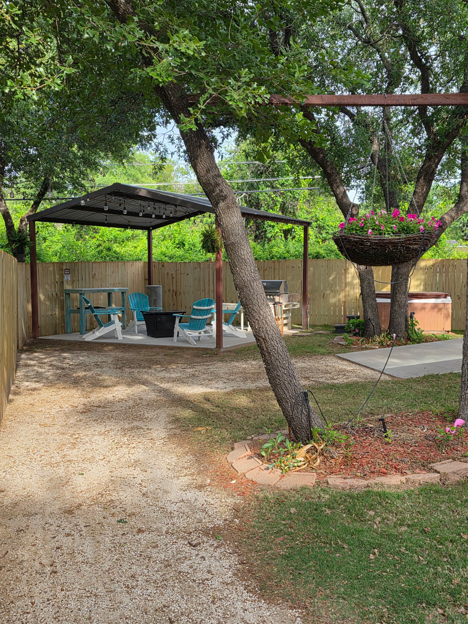 Outdoor Lighting: Extensive string lighting throughout courtyard