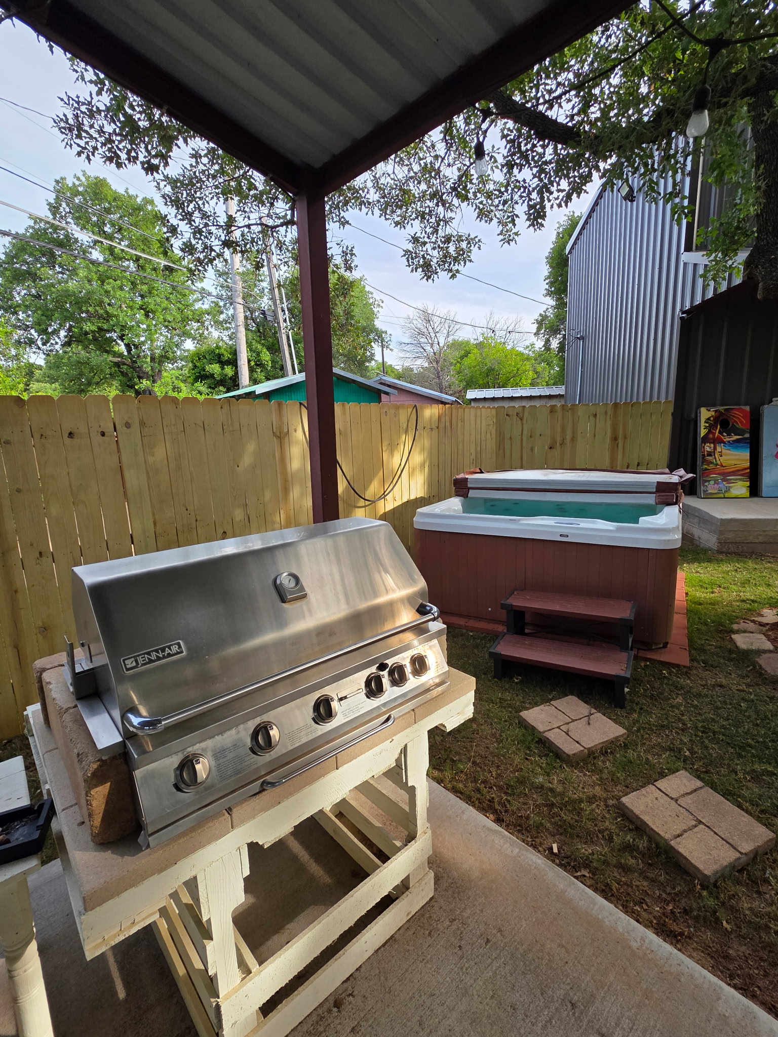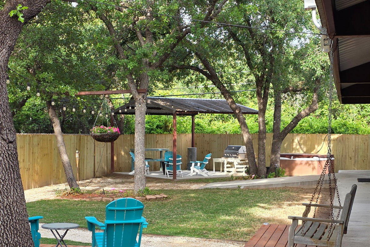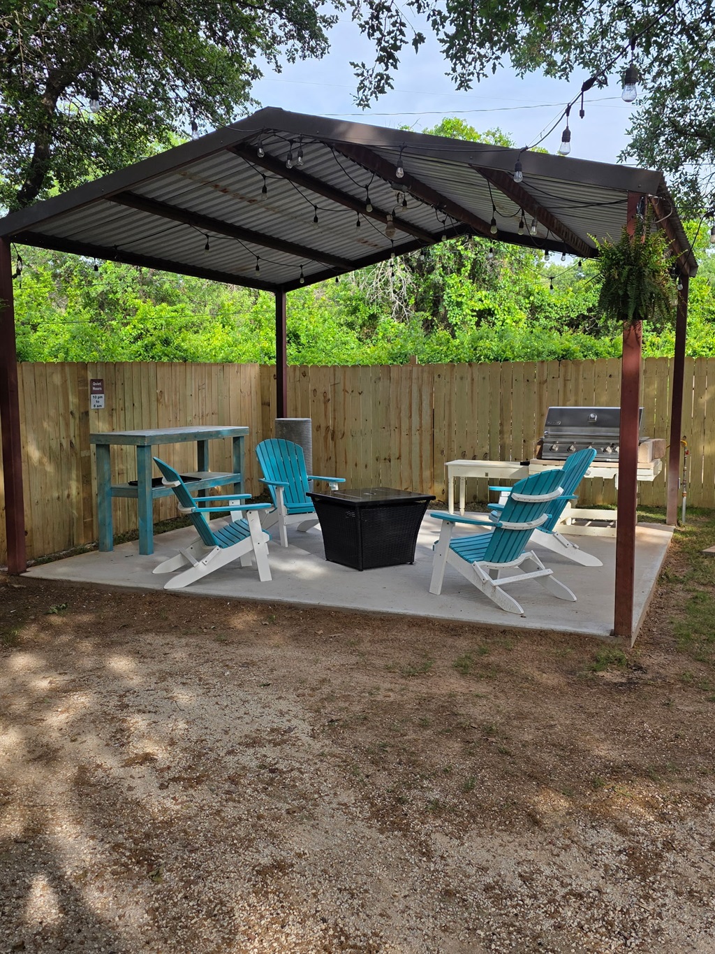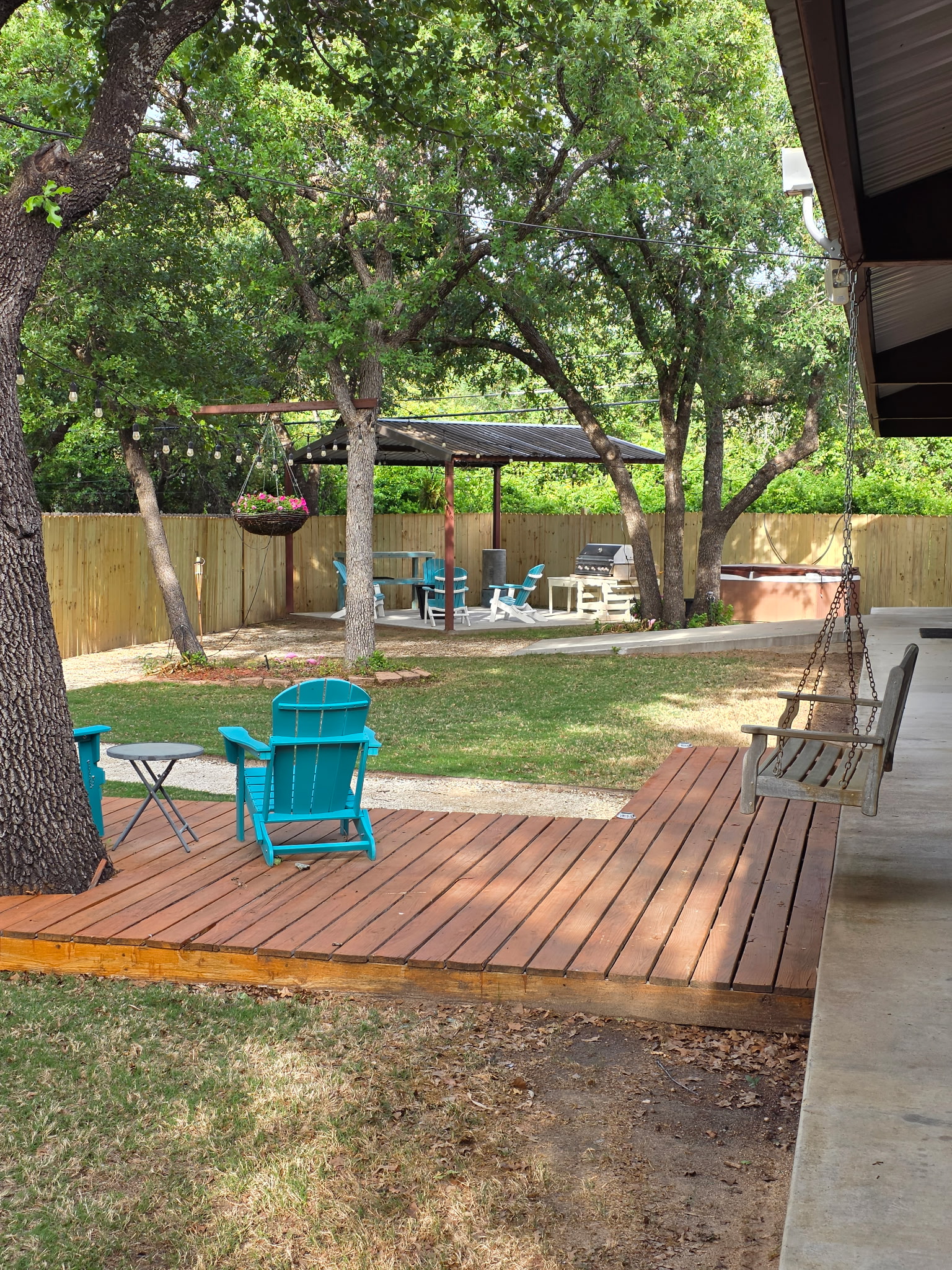 Outdoor Lighting: Extensive string lighting throughout courtyard