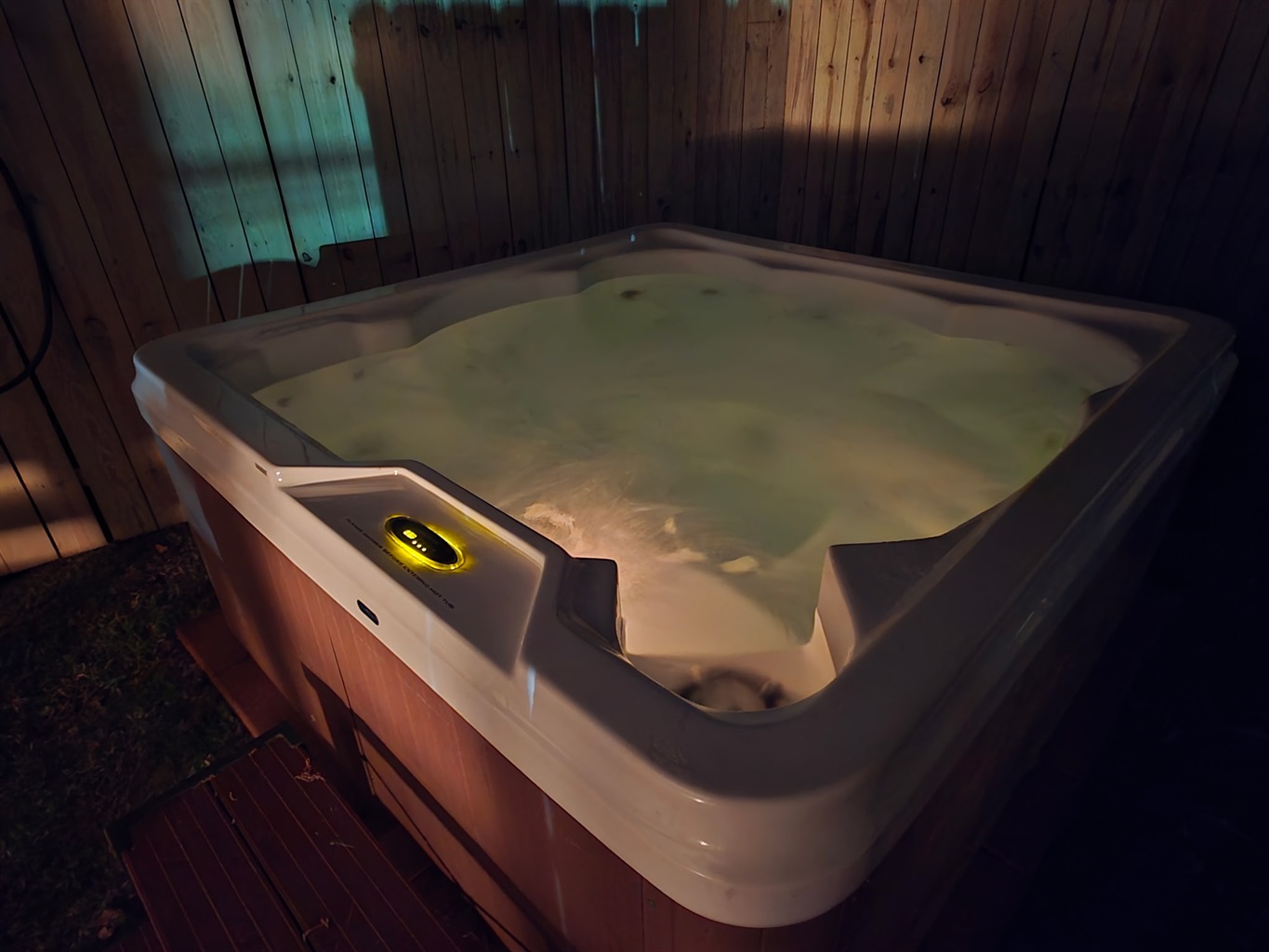 The natural setting provides privacy and serenity while the thoughtful lighting design transforms the space into an enchanting evening retreat.