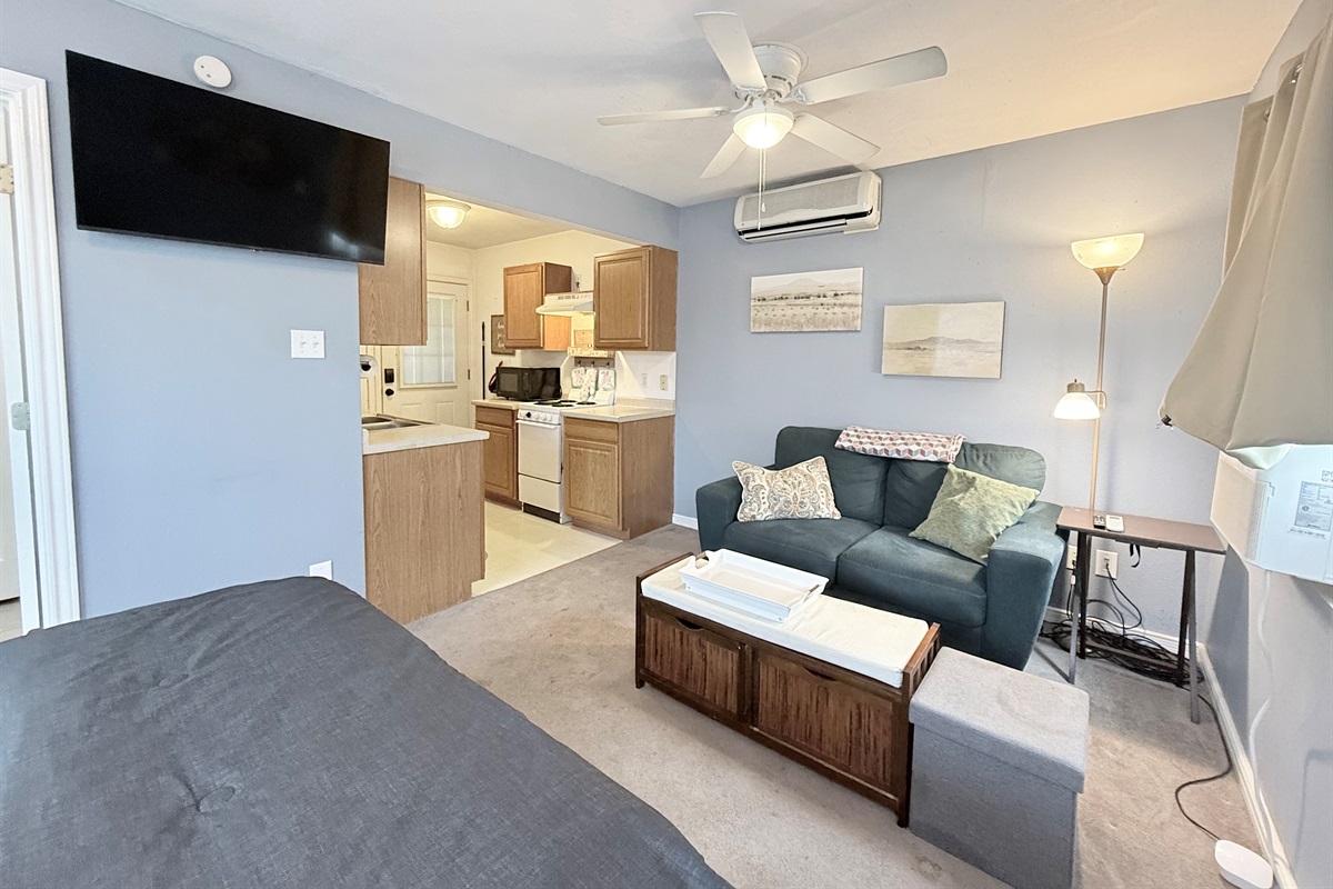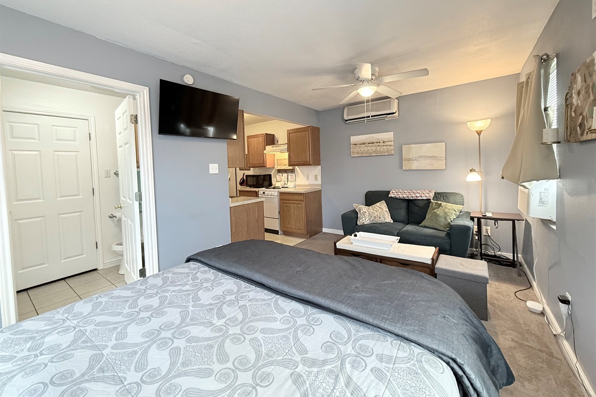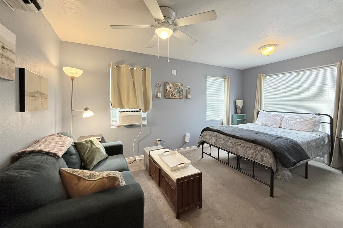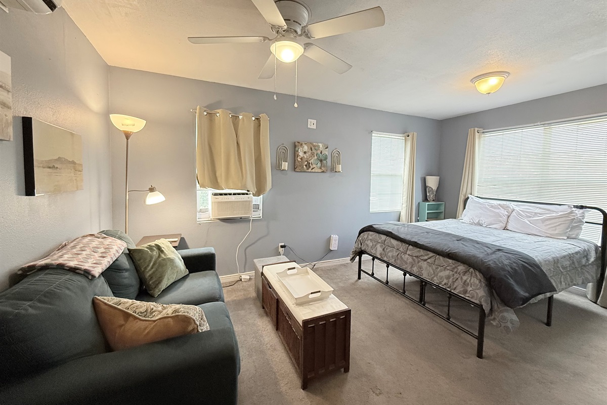 This well-appointed studio features an open-concept layout that seamlessly blends living, sleeping, and dining areas. The space is bathed in natural light from multiple windows and enhanced by ceiling fans that ensure year-round comfort.