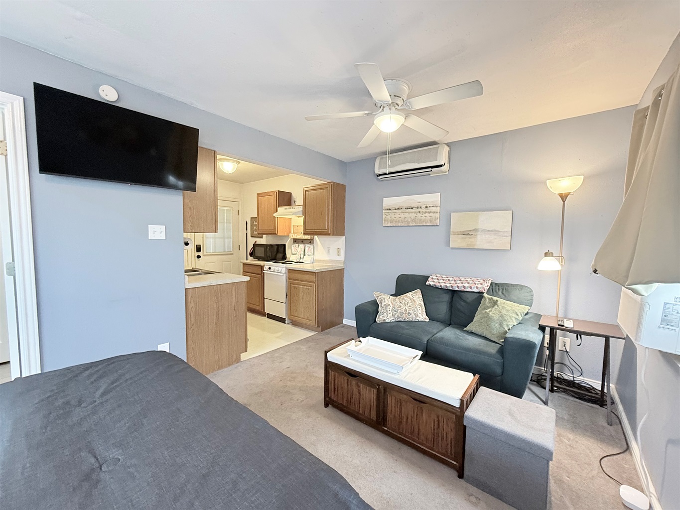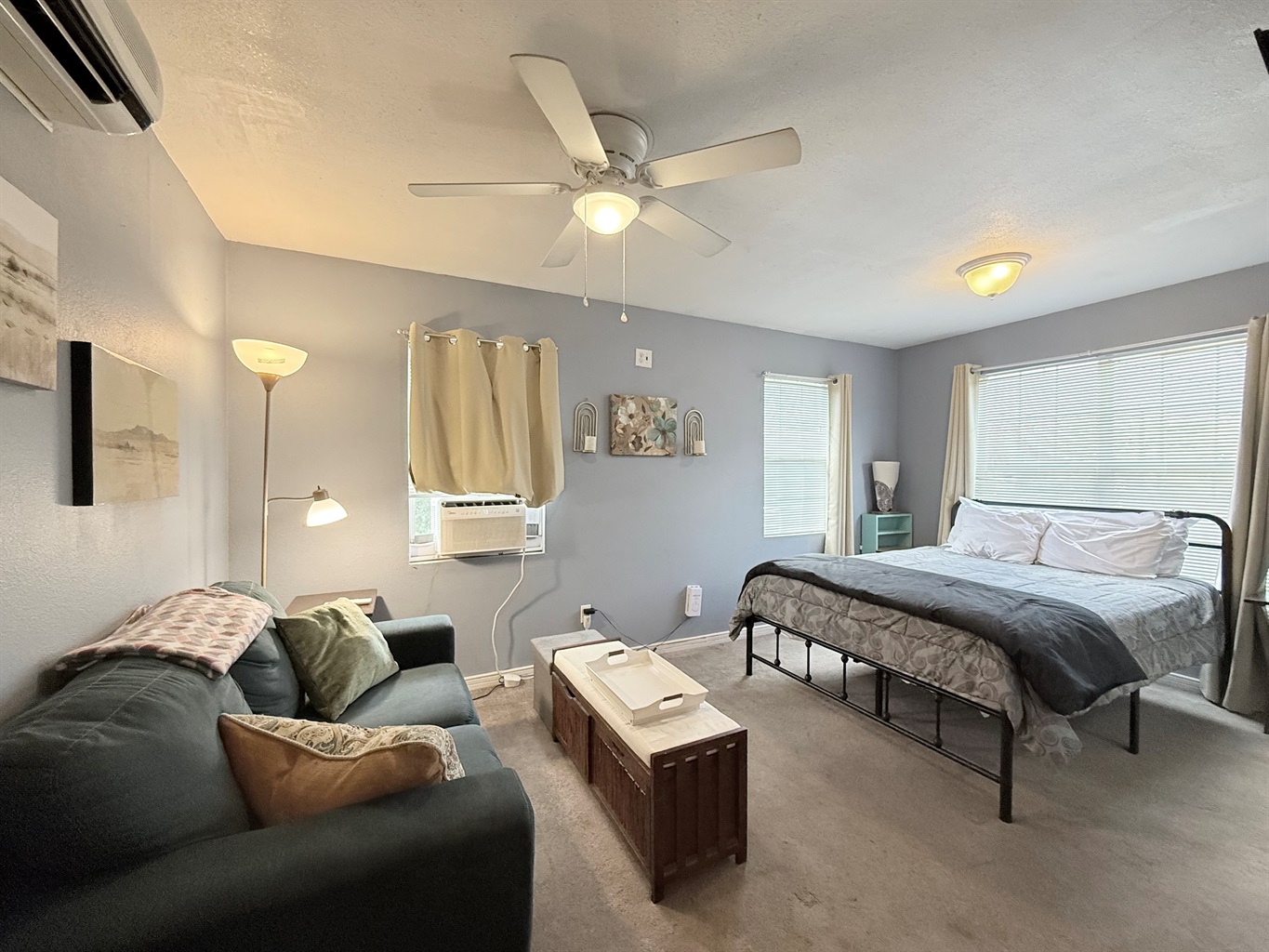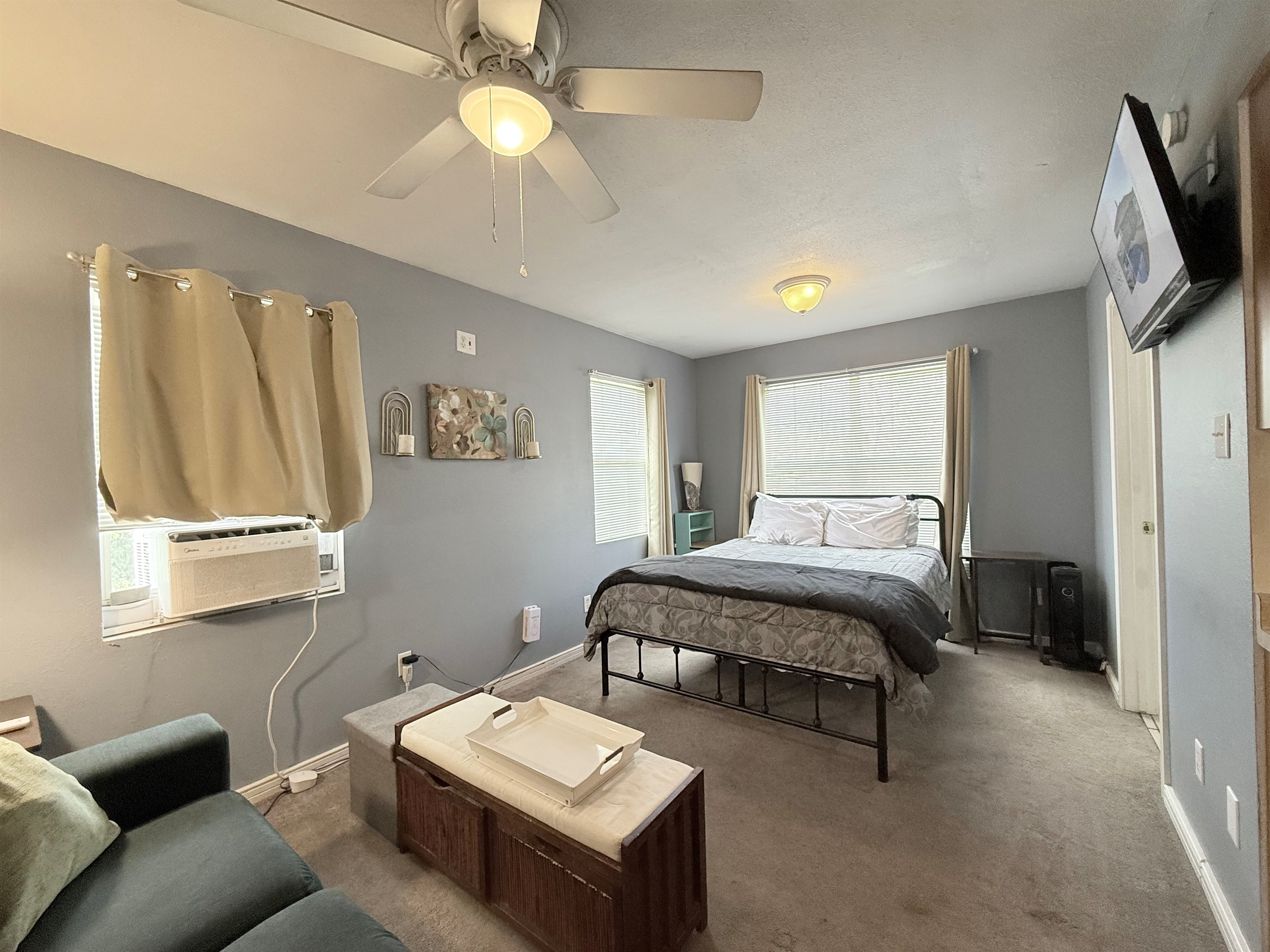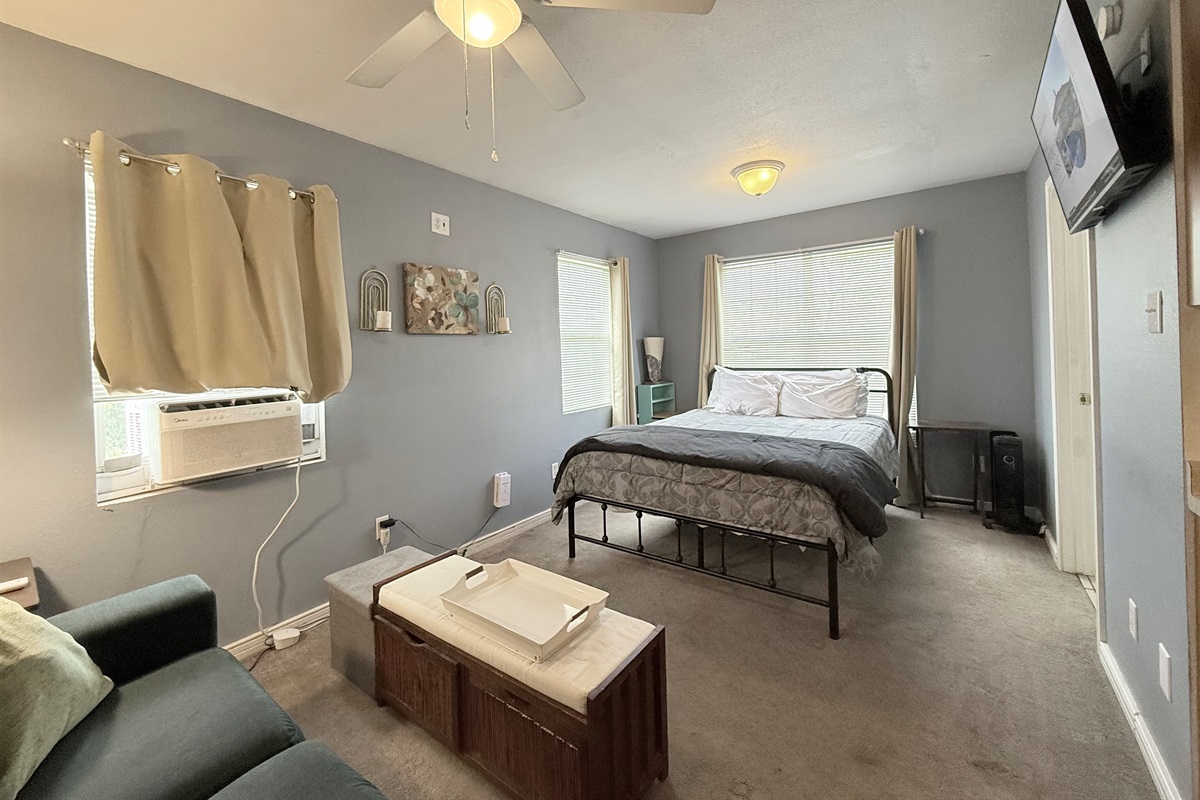 This well-appointed studio features an open-concept layout that seamlessly blends living, sleeping, and dining areas. The space is bathed in natural light from multiple windows and enhanced by ceiling fans that ensure year-round comfort.