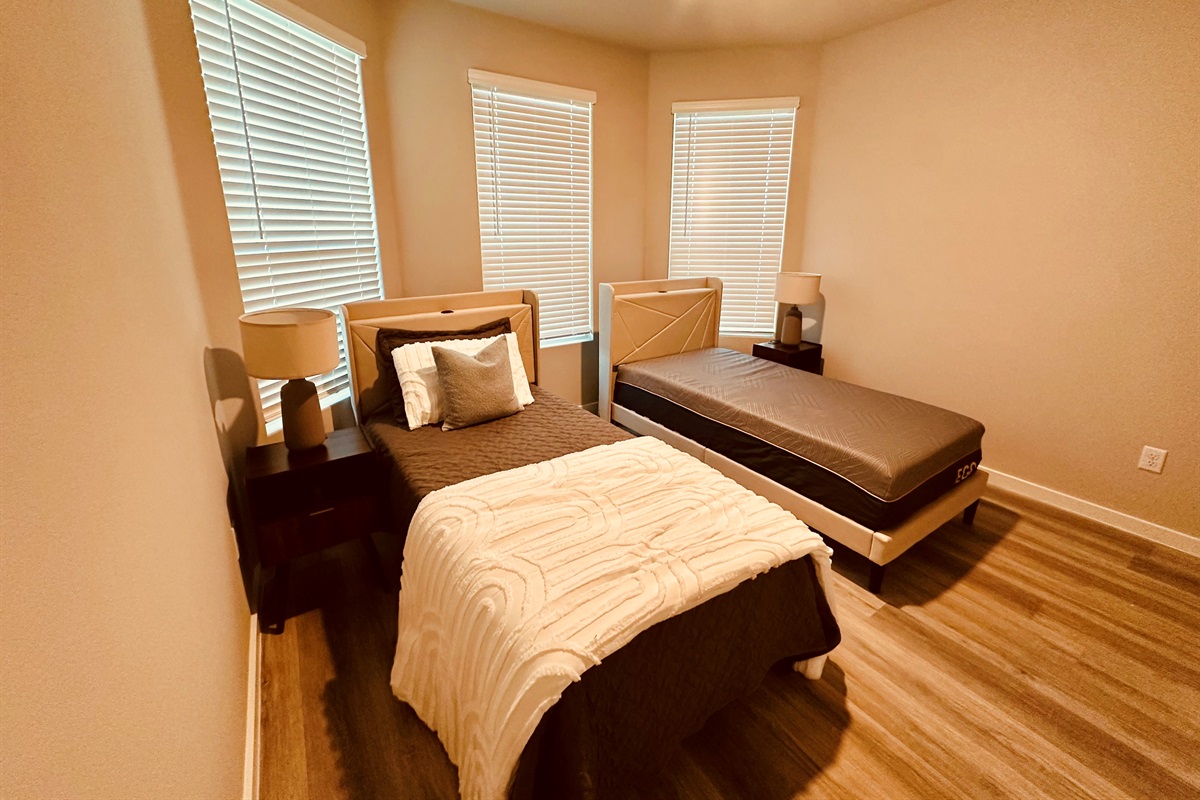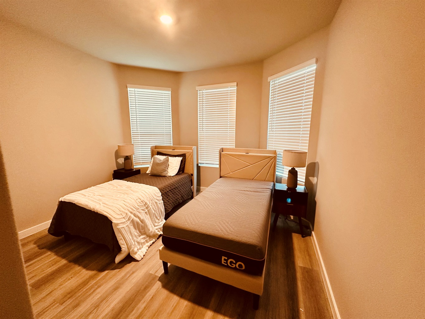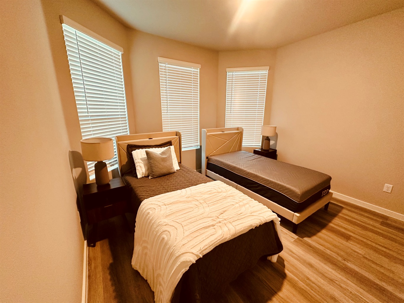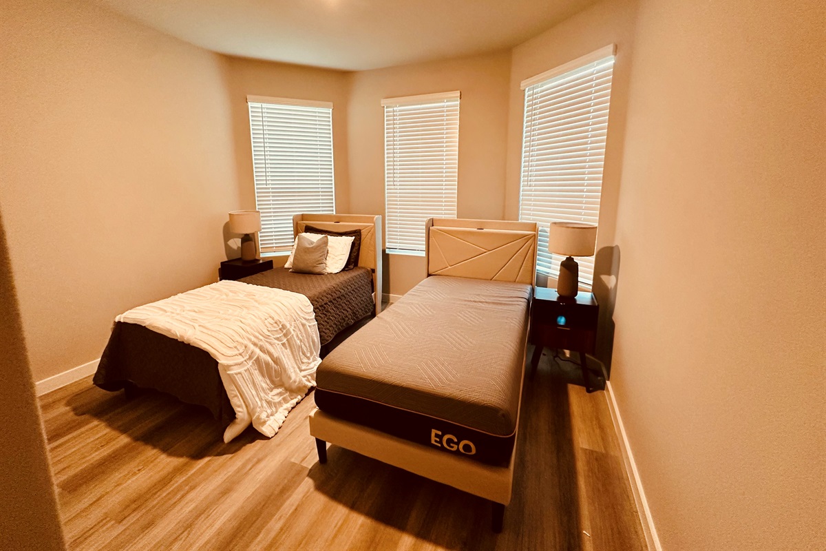 Third Bedroom: Flexibility reigns here with two twin platform beds, each with its own nightstand - ideal for kids, friends, or colleagues traveling together. Bay windows drench the room in natural light, while the neutral palette maintains visual cohesion with the rest of the home. A plush purple throw adds a touch of personality.