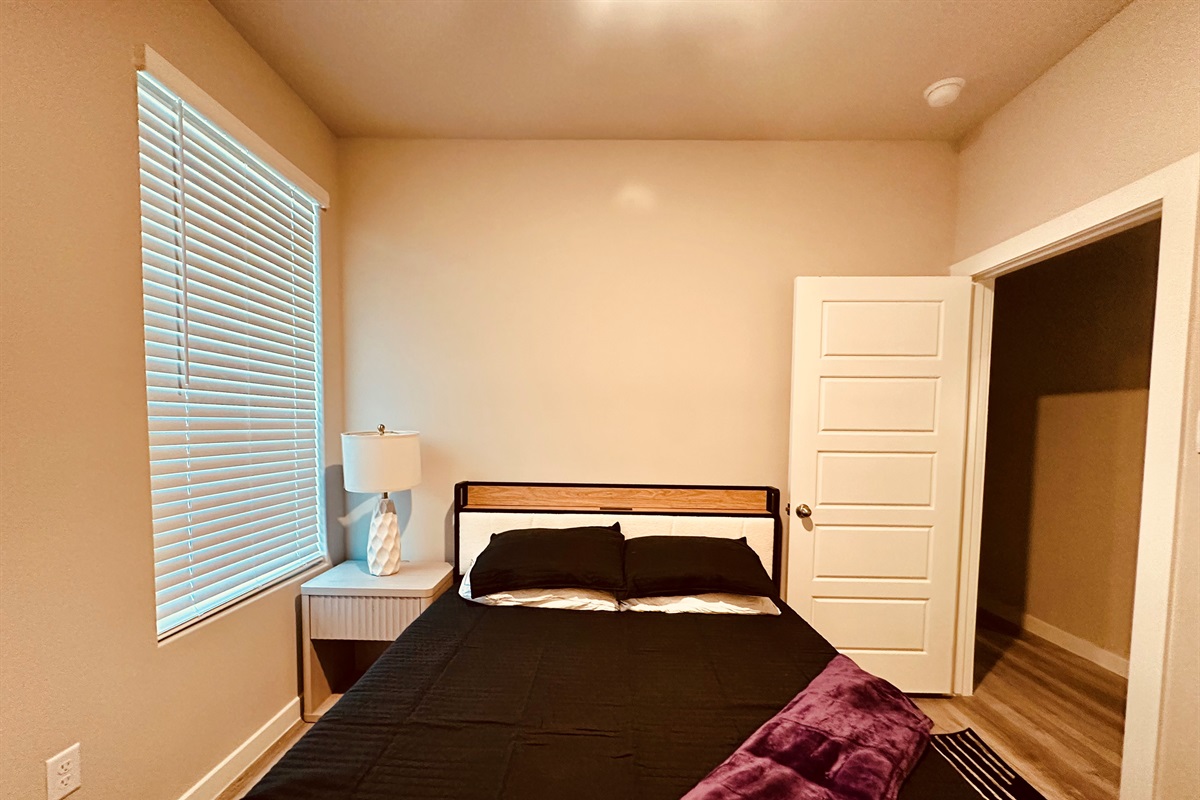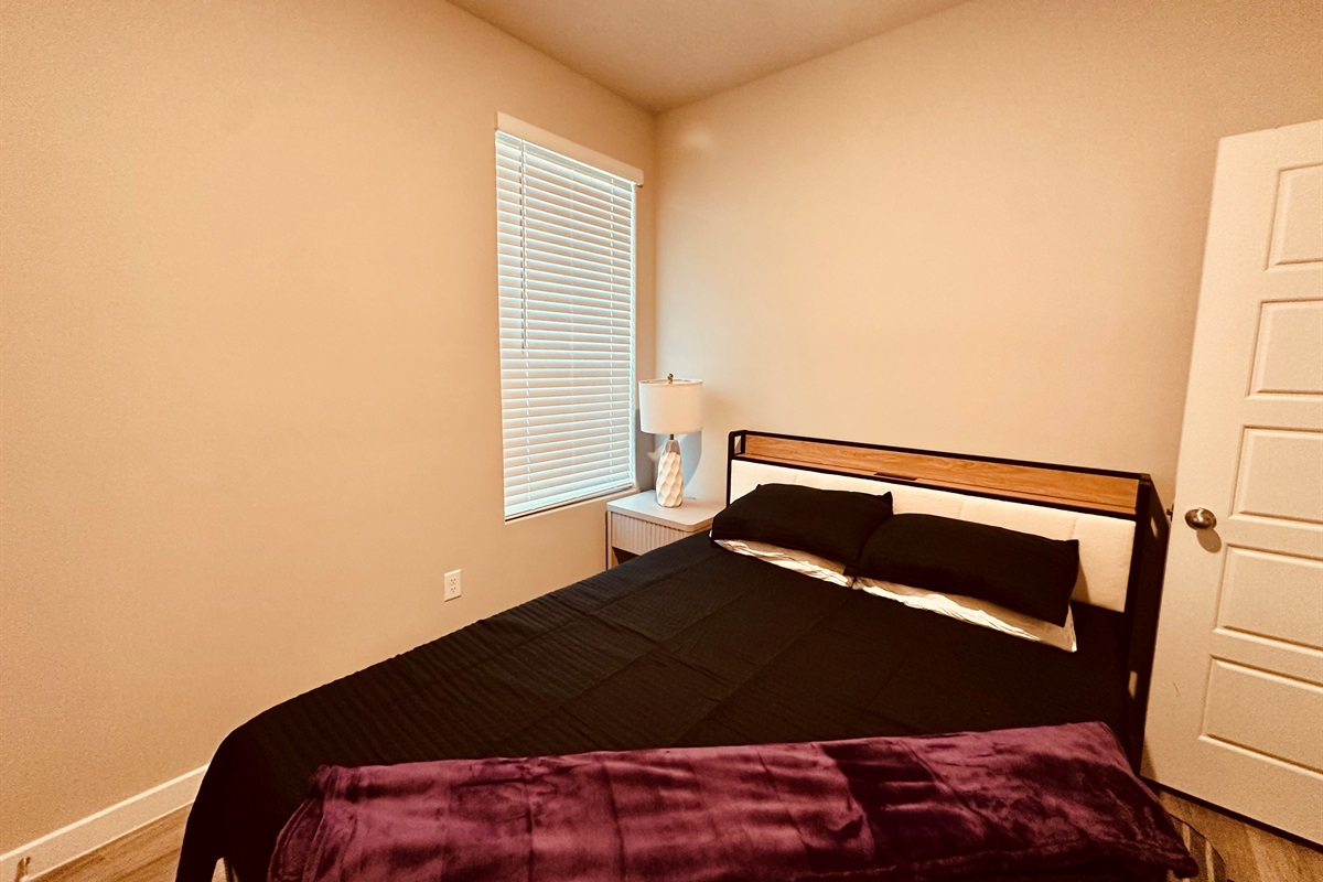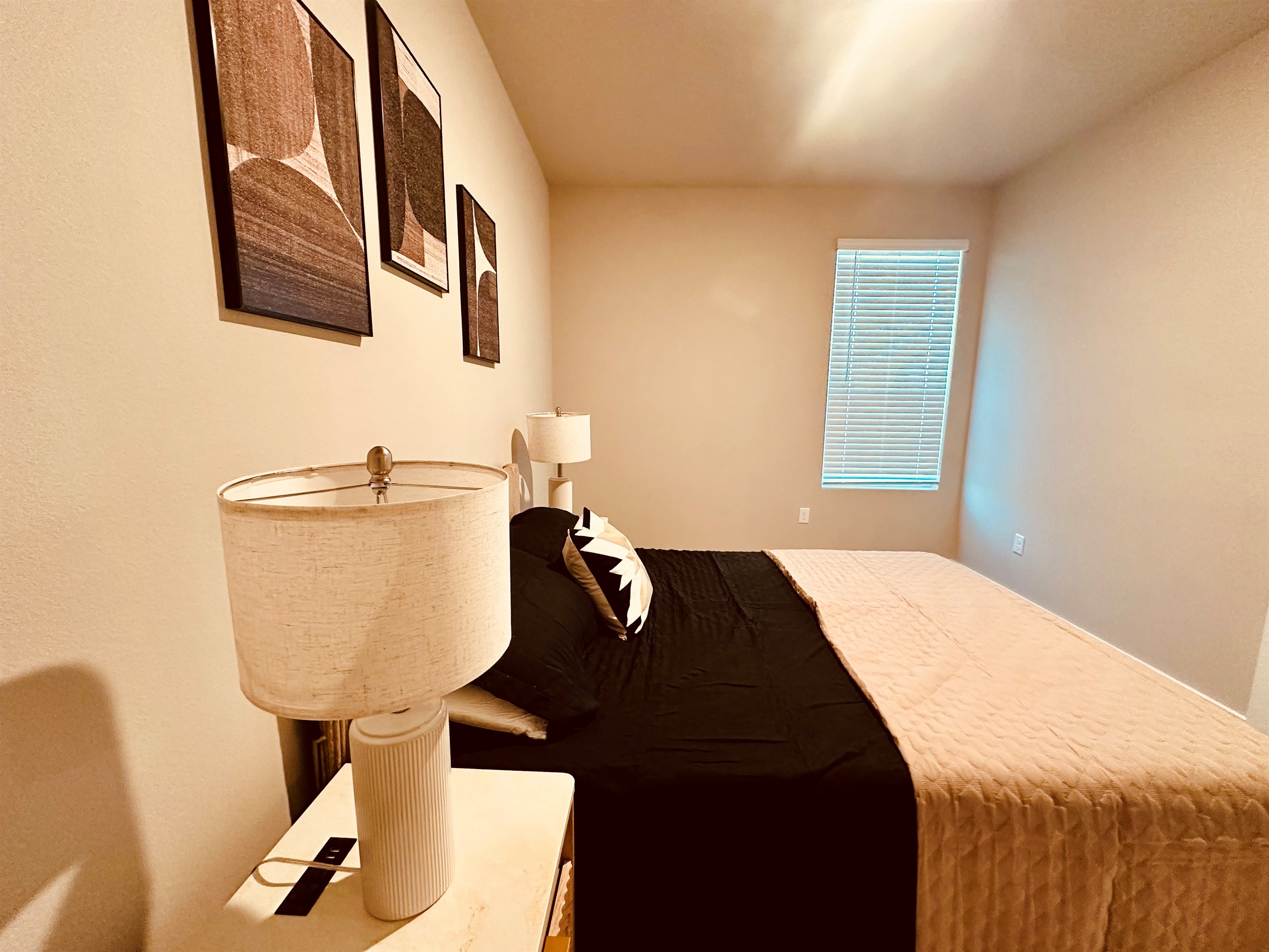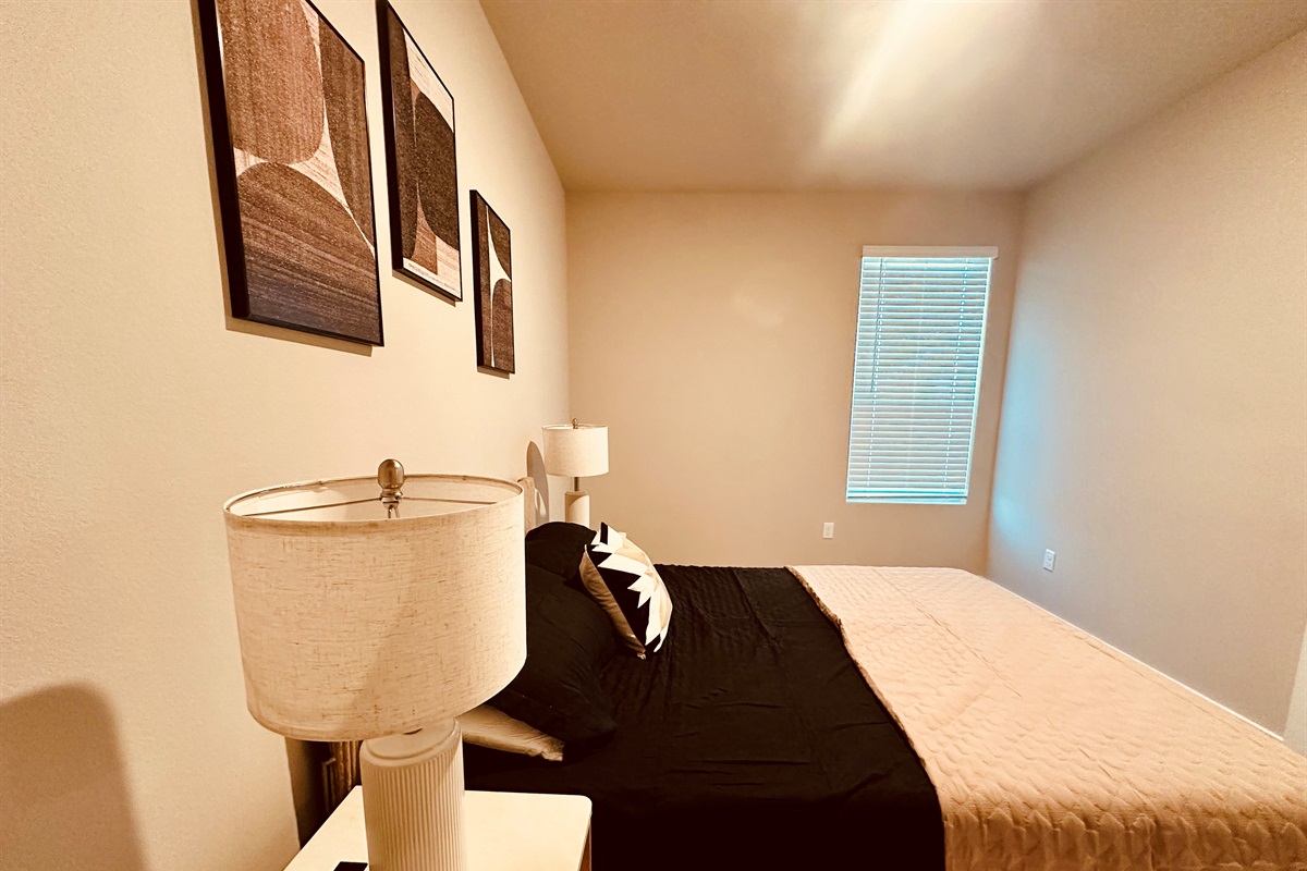 Third Bedroom: Flexibility reigns here with two twin platform beds, each with its own nightstand - ideal for kids, friends, or colleagues traveling together. Bay windows drench the room in natural light, while the neutral palette maintains visual cohesion with the rest of the home. A plush purple throw adds a touch of personality.