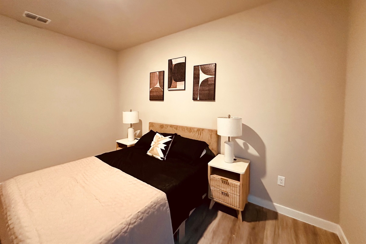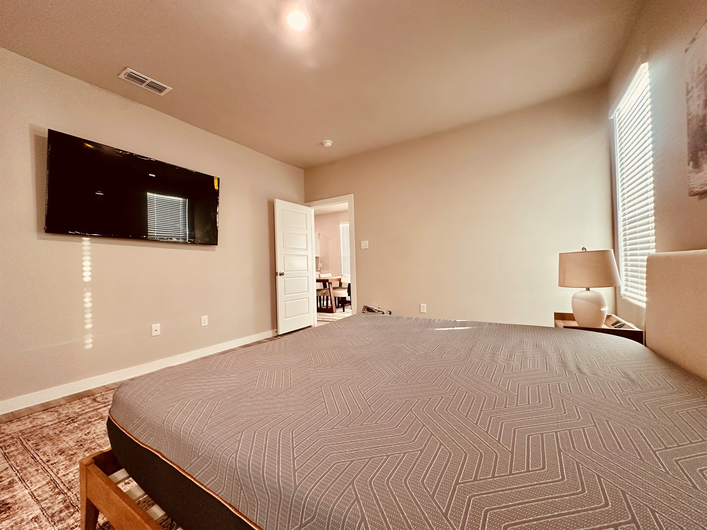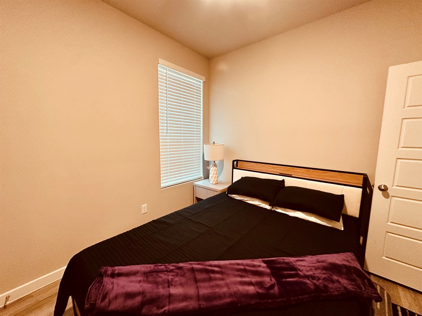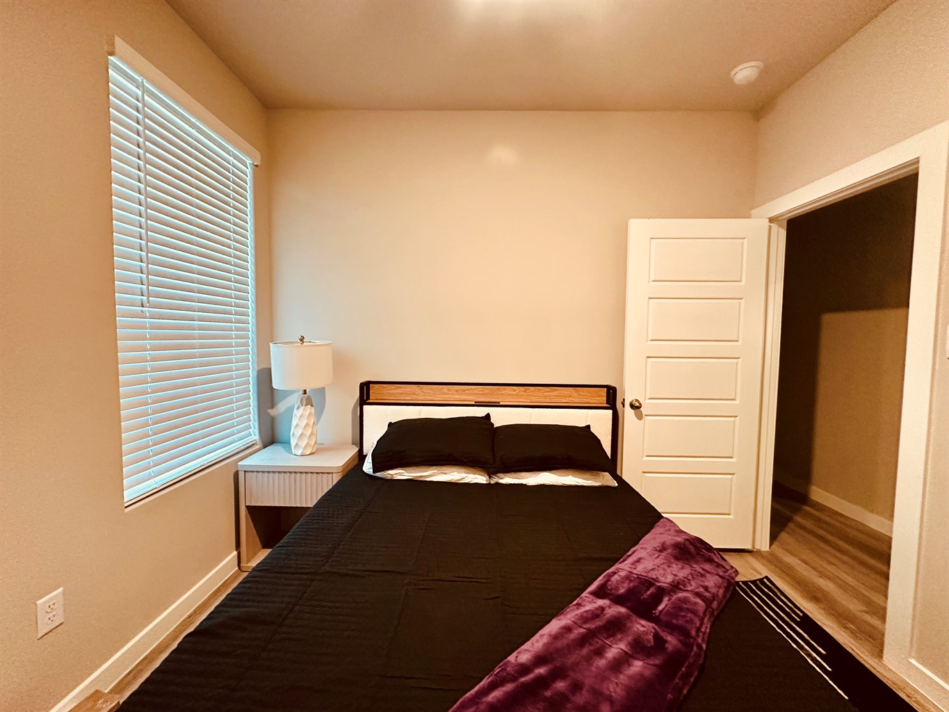 Third Bedroom: Flexibility reigns here with two twin platform beds, each with its own nightstand - ideal for kids, friends, or colleagues traveling together. Bay windows drench the room in natural light, while the neutral palette maintains visual cohesion with the rest of the home. A plush purple throw adds a touch of personality.