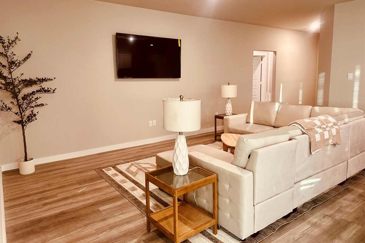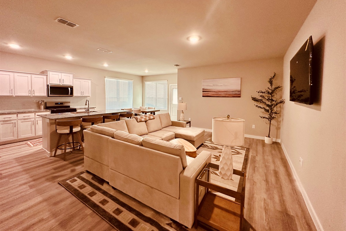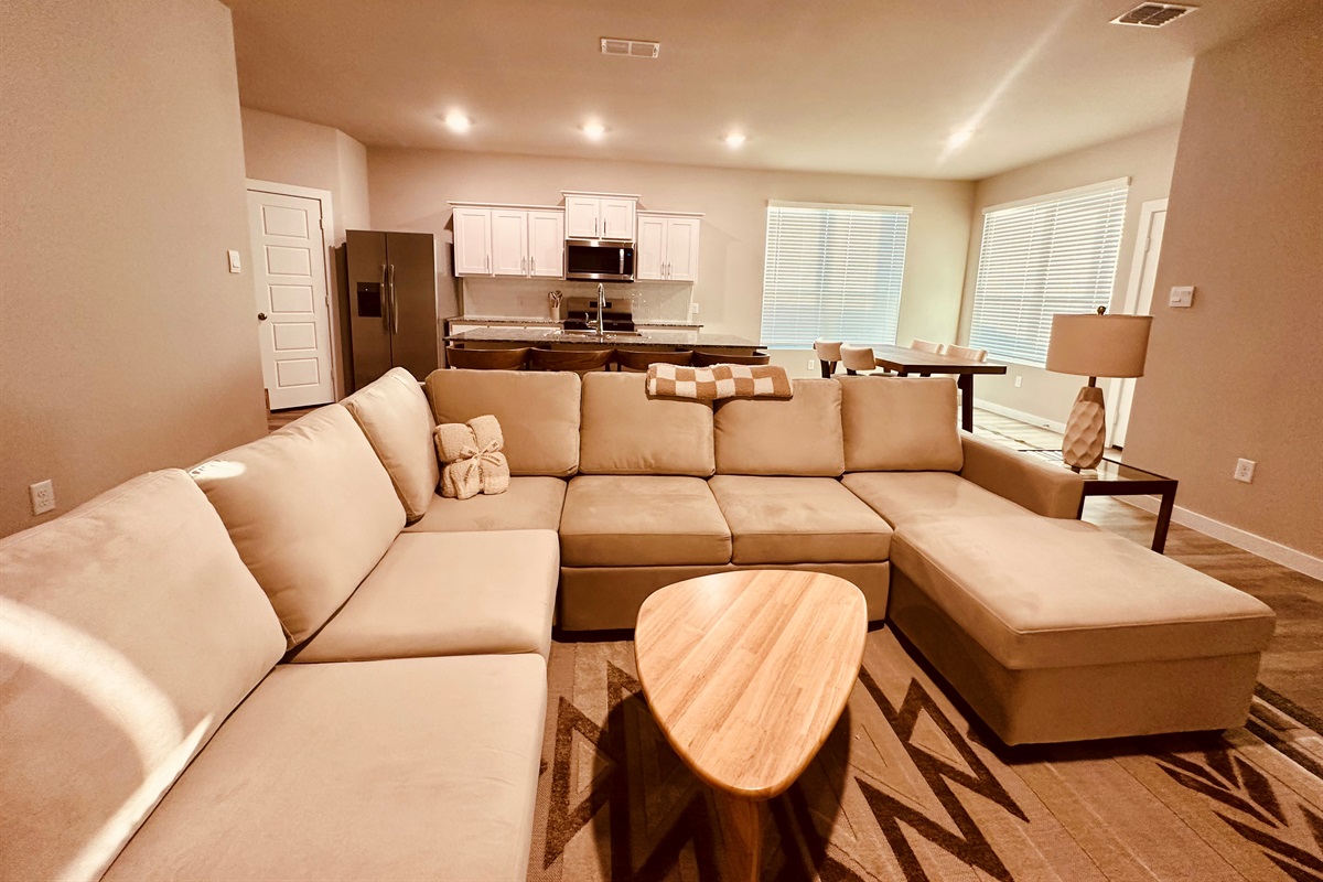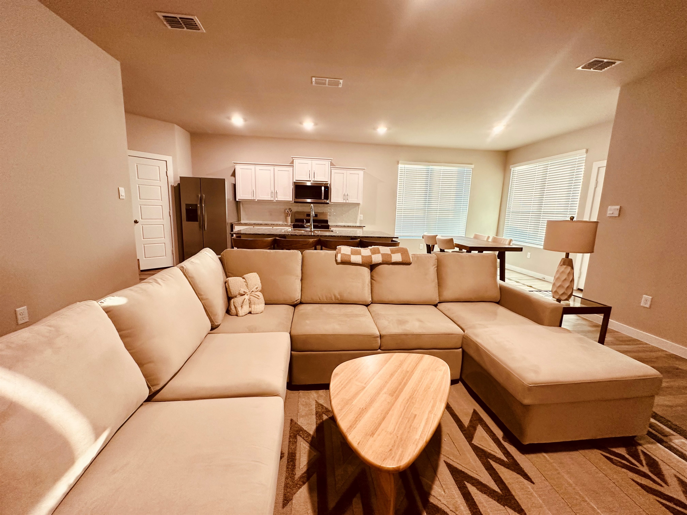 Sink into the oversized cream sectional that practically floats on light wood-look flooring, positioned for optimal TV viewing or lively conversation. A geometric rust-and-cream runner adds visual warmth without cluttering the minimalist aesthetic. Recessed lighting bathes everything in soft illumination, while large windows welcome Texas sunshine throughout the day.