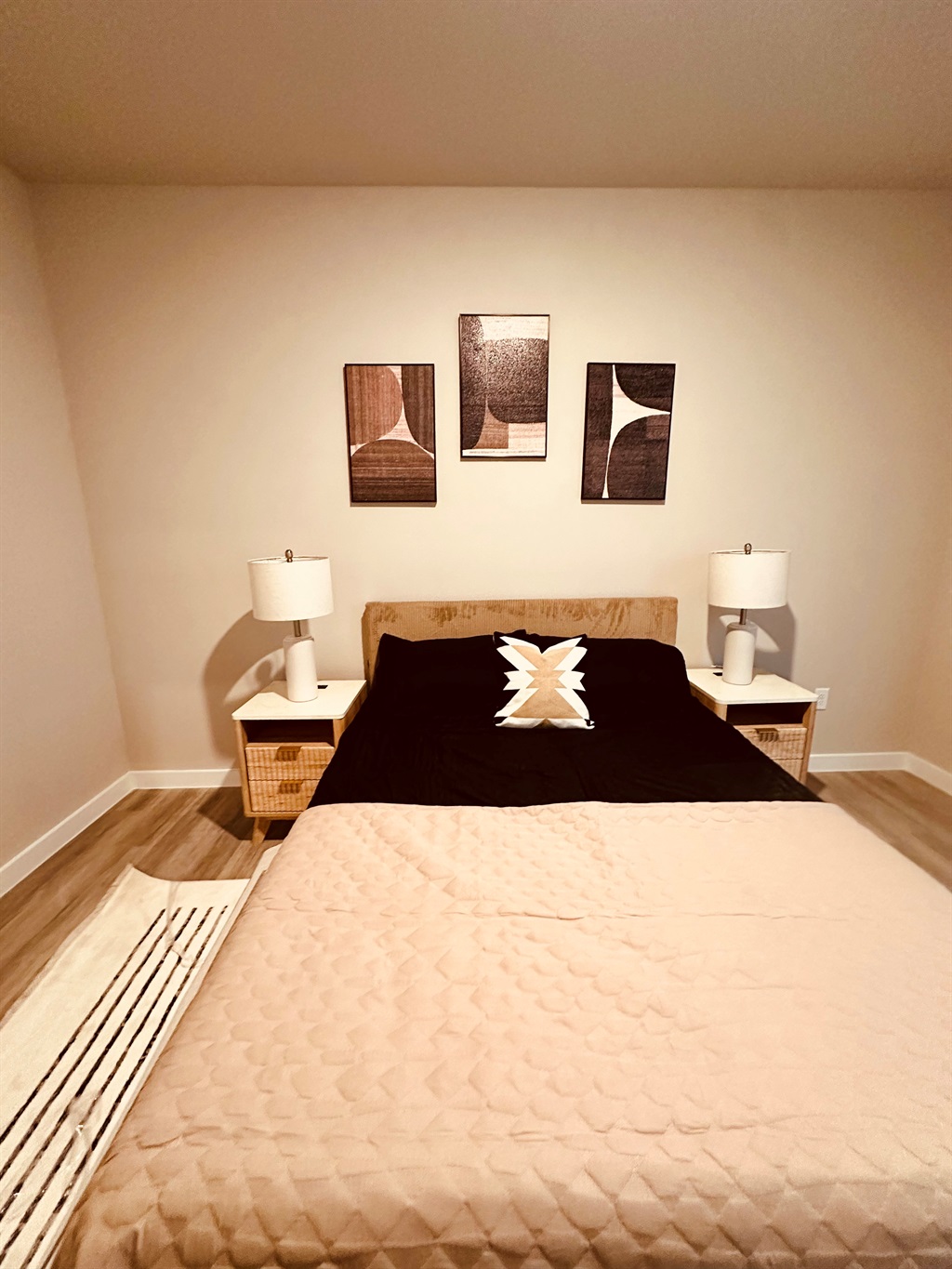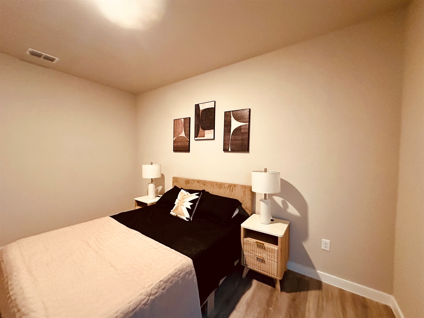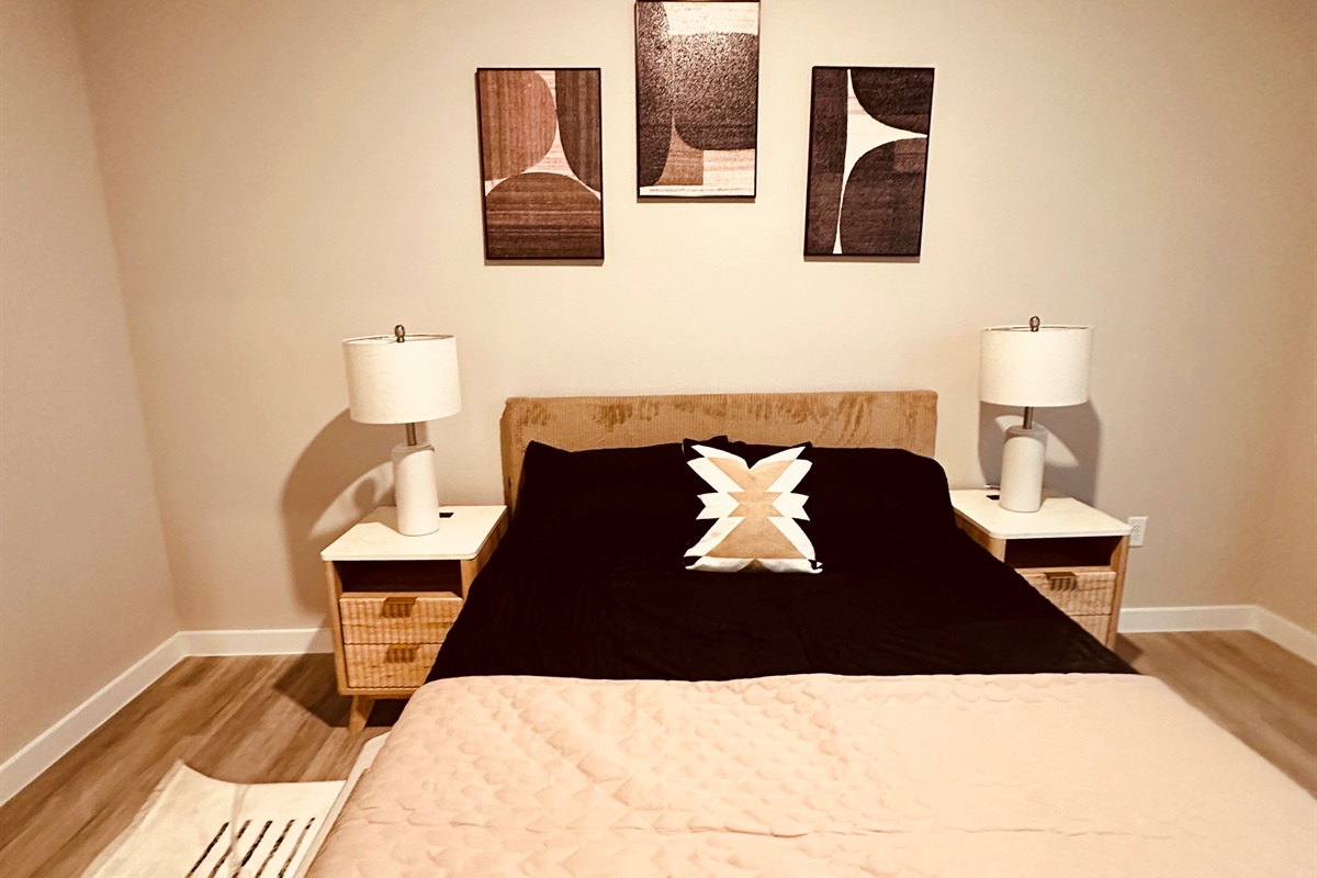 Second Bedroom: Another queen sanctuary dressed in sophisticated black and white linens with a striking wood headboard. Twin nightstands with contemporary lamps provide symmetry and function. Abstract photography in warm tones adorns the walls, adding artistic flair without overwhelming the zen-like simplicity.
