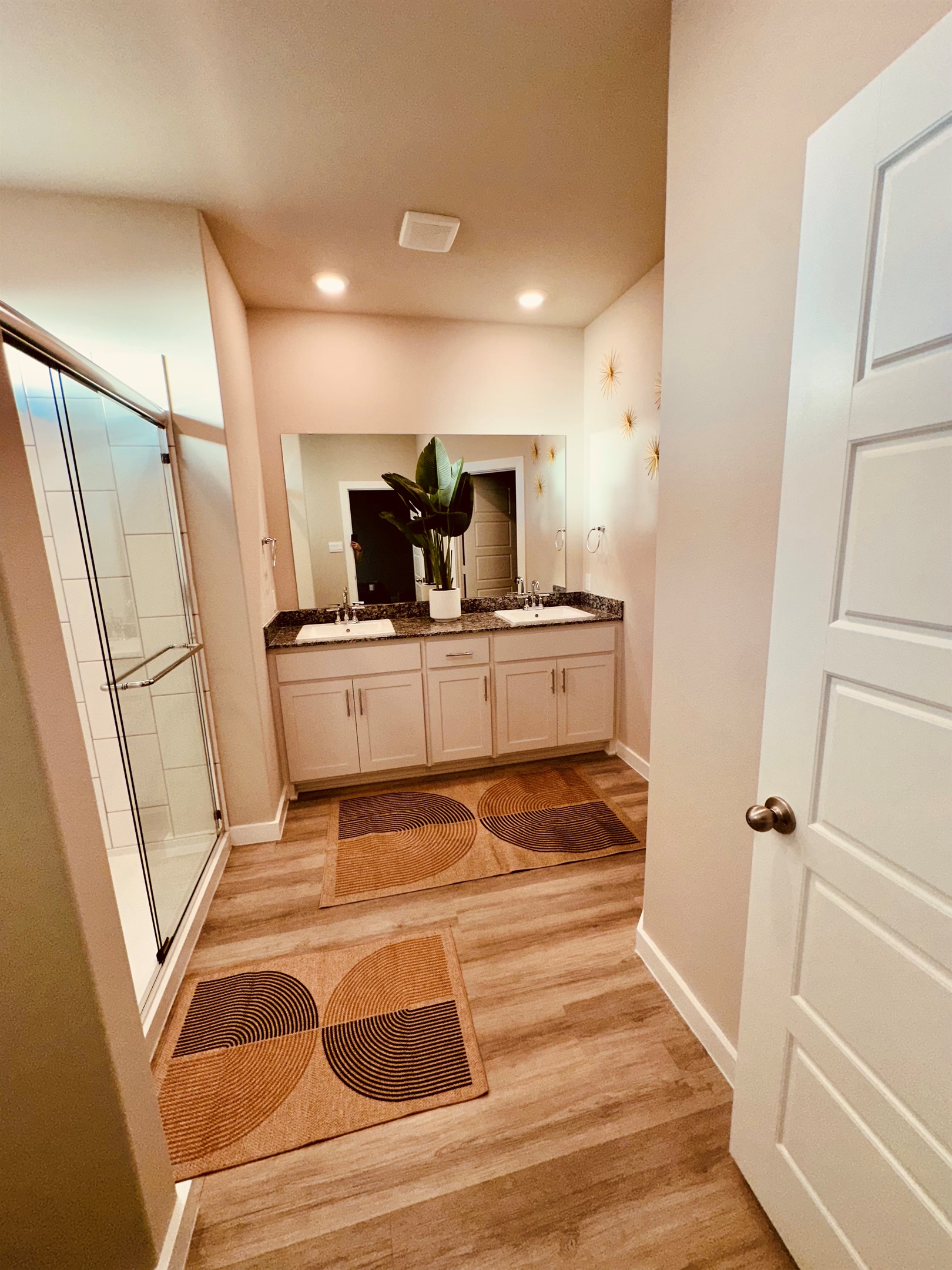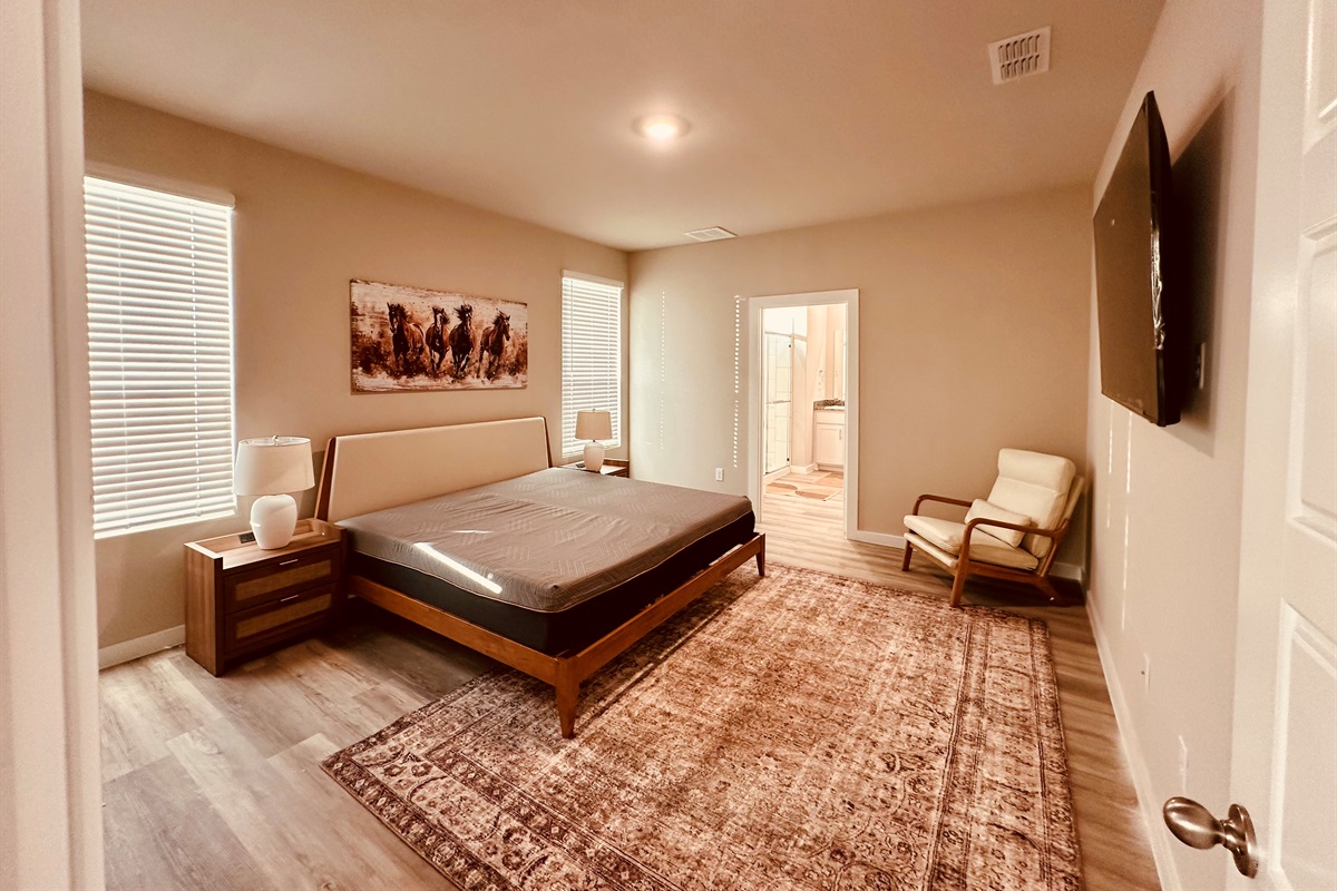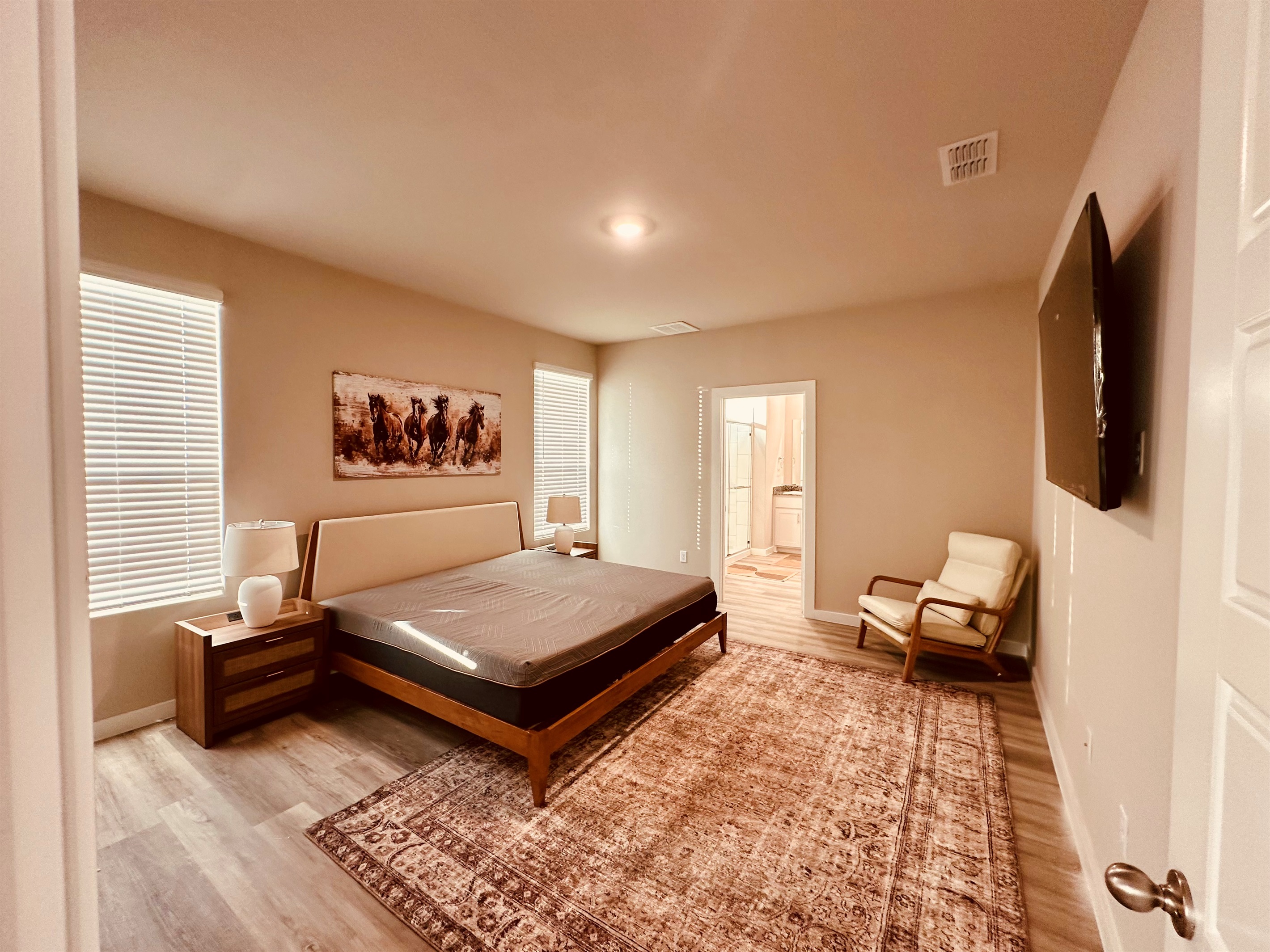 Master Suite: The primary bedroom commands attention with its low-profile platform bed topped in luxe gray bedding. A mounted flat-screen TV faces the bed, flanked by modern nightstands with white shades casting gentle ambient light. Rich wood flooring continues throughout, complemented by plush area rugs underfoot. Adjacent built-in cabinetry keeps belongings organized and out of sight.