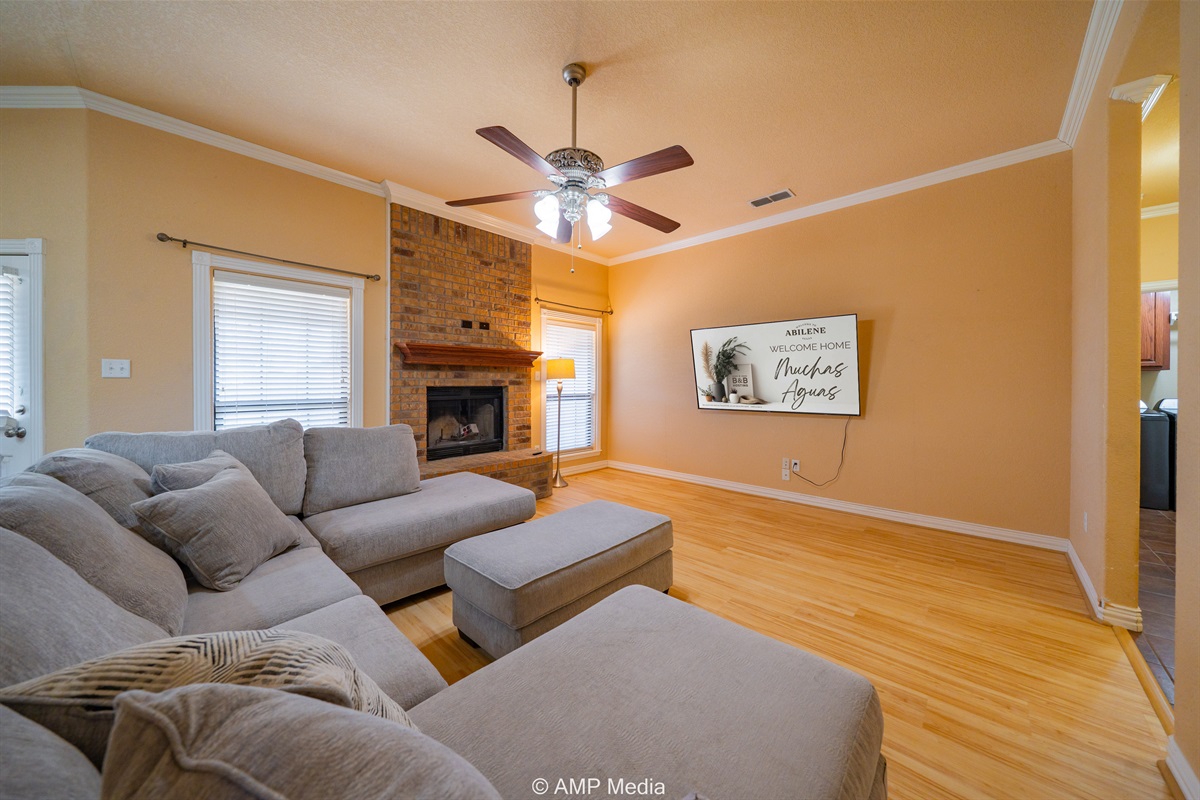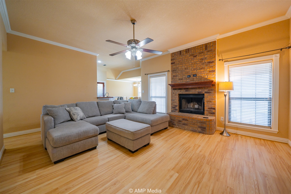 The heart of the home centers around a spacious living room with soaring vaulted ceilings and a stunning brick fireplace that adds both character and coziness. Natural light floods the space through multiple windows, while beautiful hardwood flooring extends throughout the main living areas and bedrooms. The open floor plan allows for easy conversation and entertainment, whether you're cooking in the kitchen, dining with family, or relaxing by the fire.