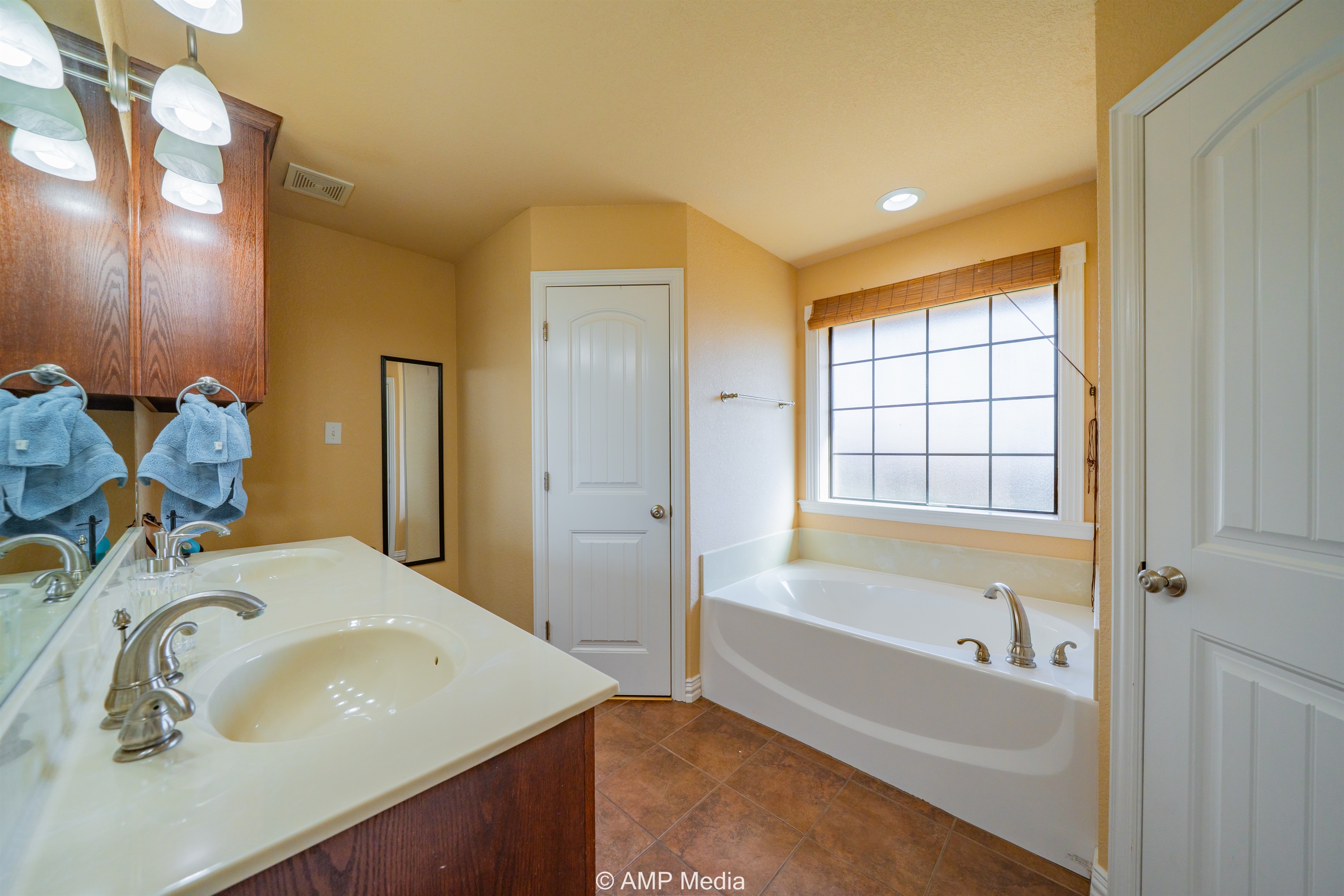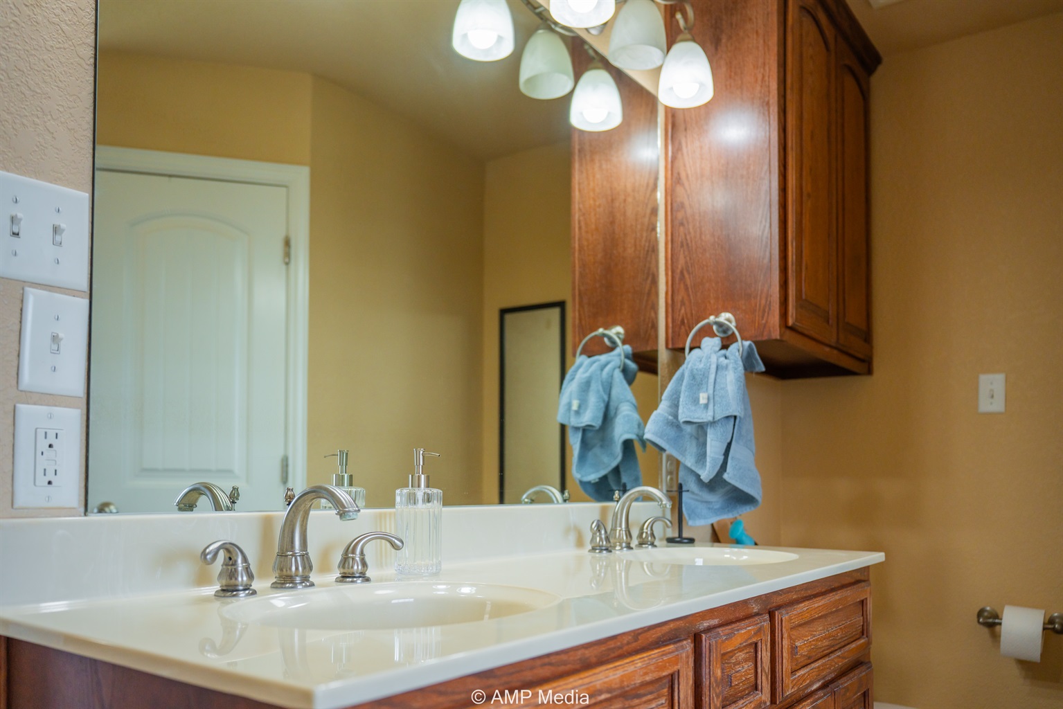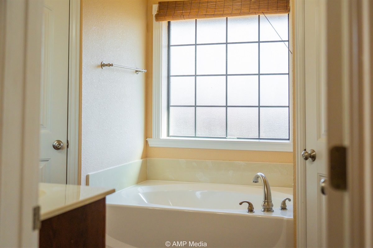 The property includes two full bathrooms plus an elegant master ensuite. The master bathroom is a true spa-like sanctuary featuring a large soaking tub perfect for unwinding, a separate walk-in shower with glass enclosure, dual vanity sinks, and tasteful tile flooring. The guest bathroom offers a tub/shower combination, vanity, and all the amenities your guests will need. An additional convenient laundry room with washer and dryer keeps everything running smoothly during your stay.