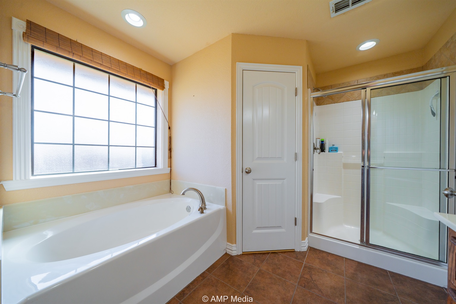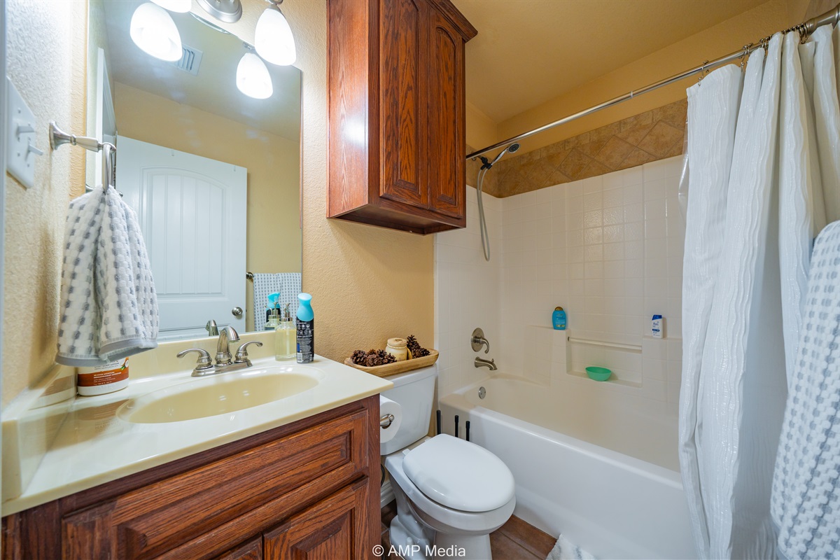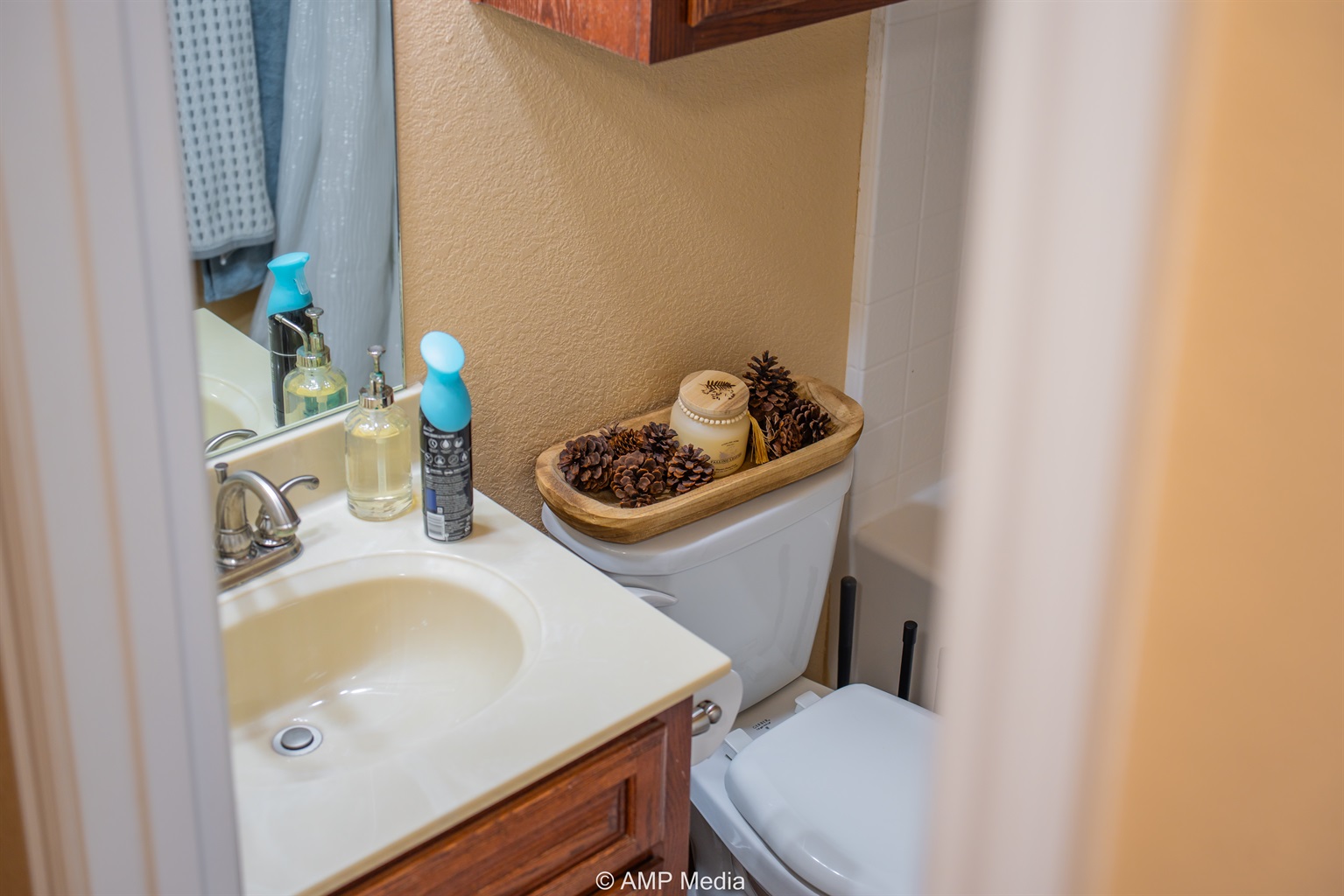 The property includes two full bathrooms plus an elegant master ensuite. The master bathroom is a true spa-like sanctuary featuring a large soaking tub perfect for unwinding, a separate walk-in shower with glass enclosure, dual vanity sinks, and tasteful tile flooring. The guest bathroom offers a tub/shower combination, vanity, and all the amenities your guests will need. An additional convenient laundry room with washer and dryer keeps everything running smoothly during your stay.