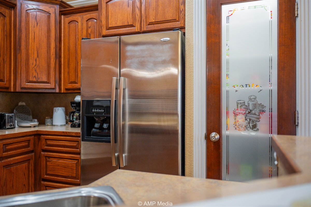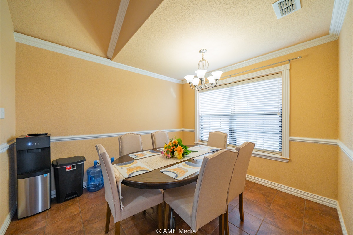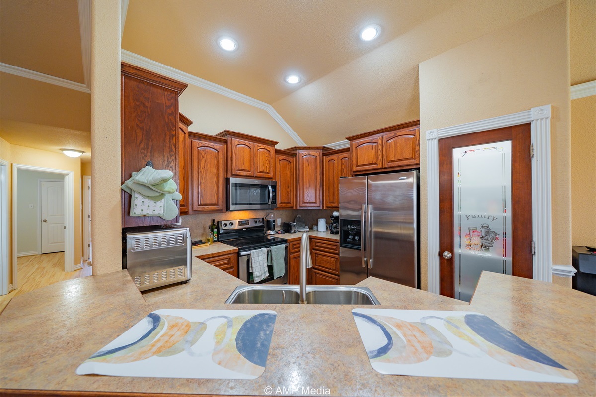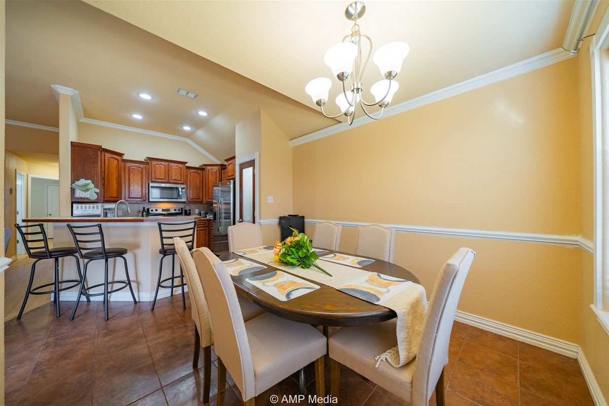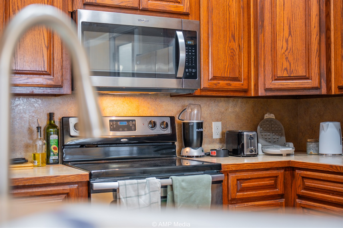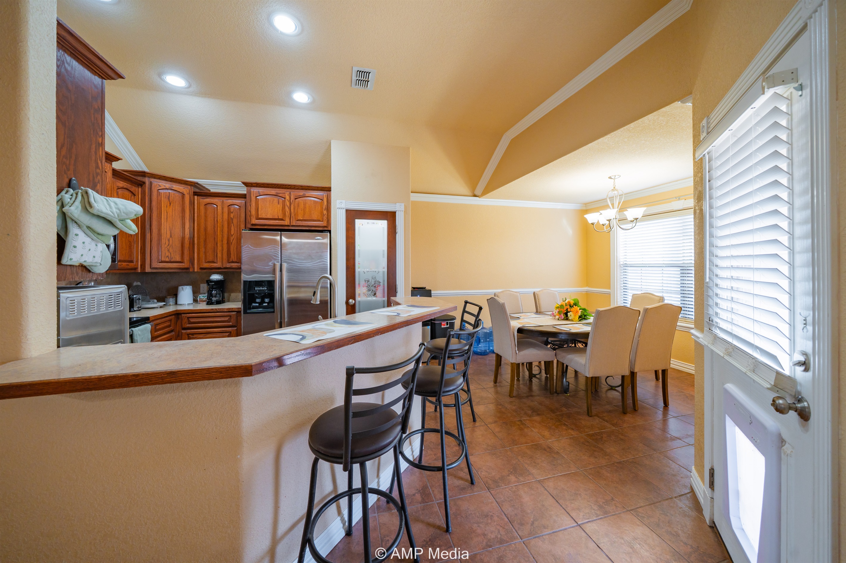 The well-appointed kitchen is a chef's dream, featuring rich oak cabinetry, smooth countertops, and a full suite of stainless steel appliances including refrigerator, range, microwave, and dishwasher. The generous breakfast bar with seating provides the perfect spot for casual meals or morning coffee. The adjacent formal dining area comfortably seats 6-8 guests and offers an elegant setting for memorable meals together.