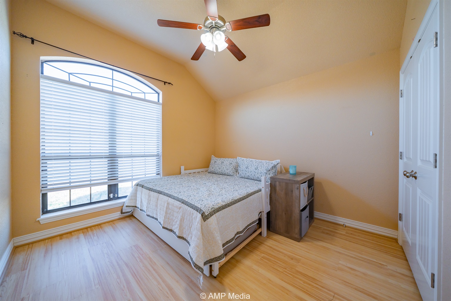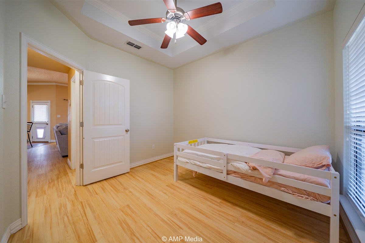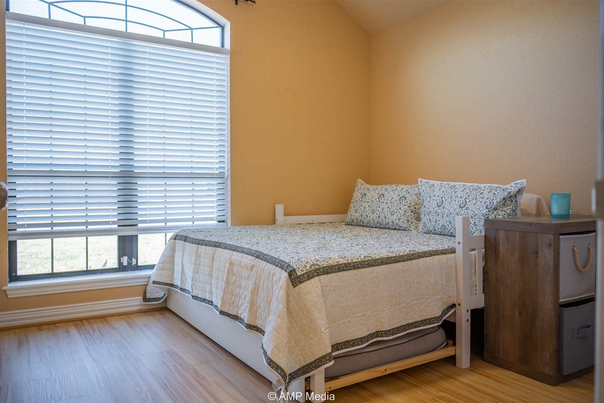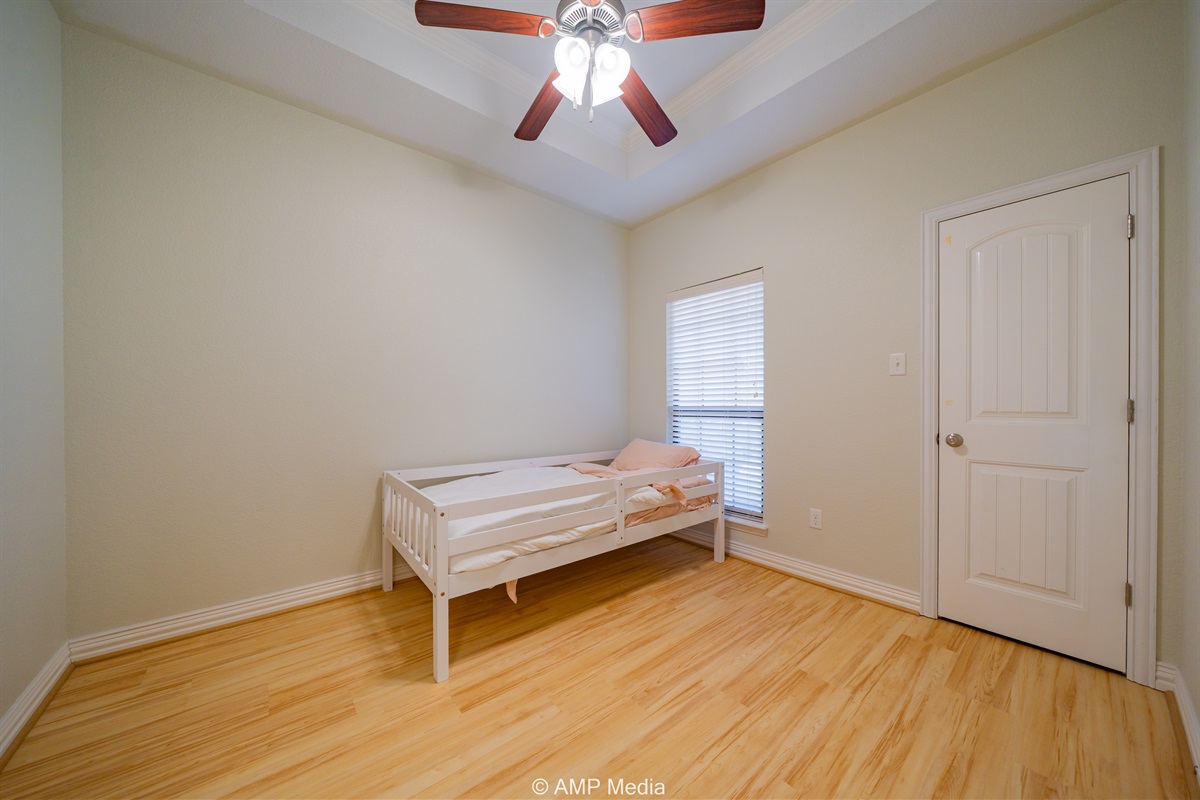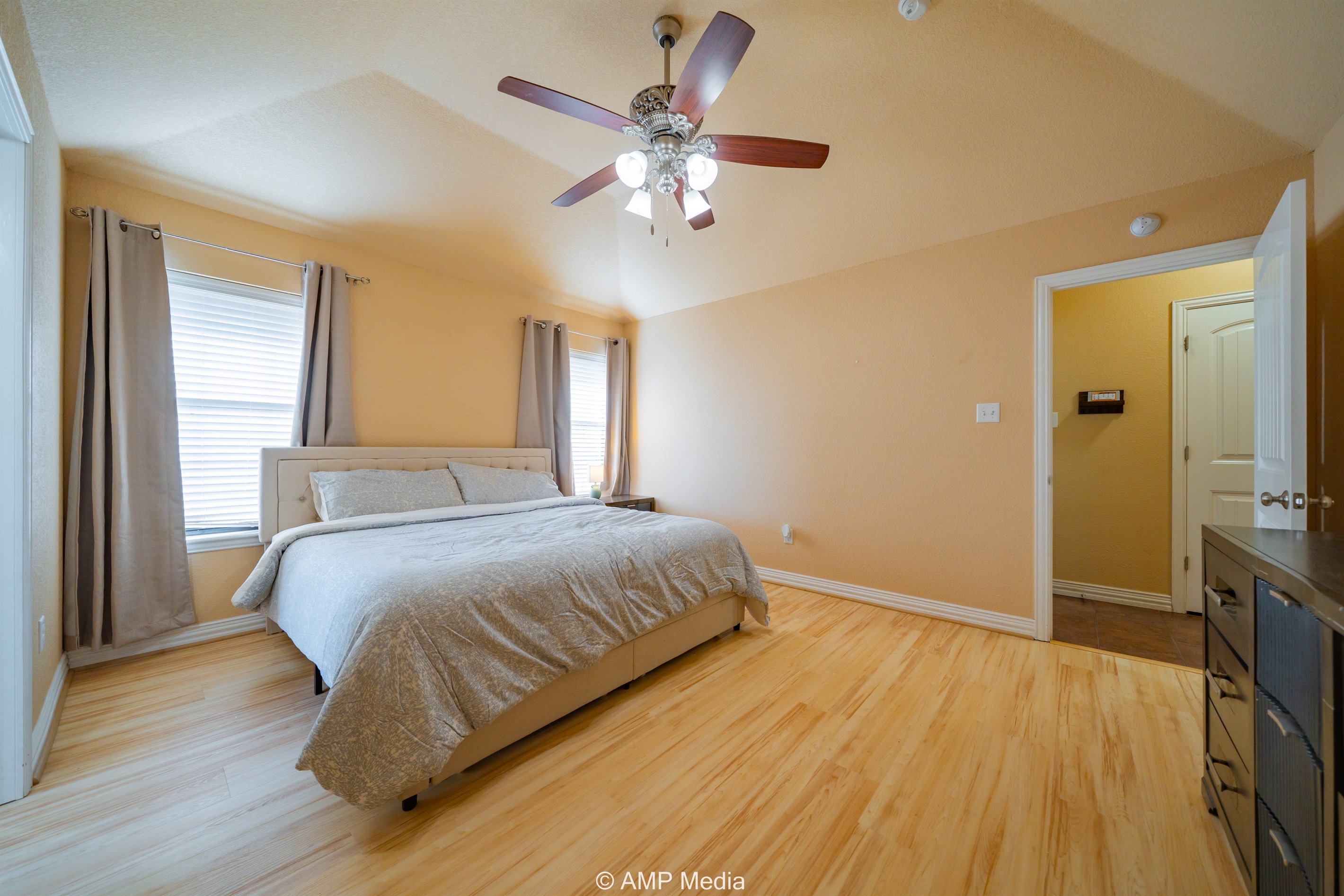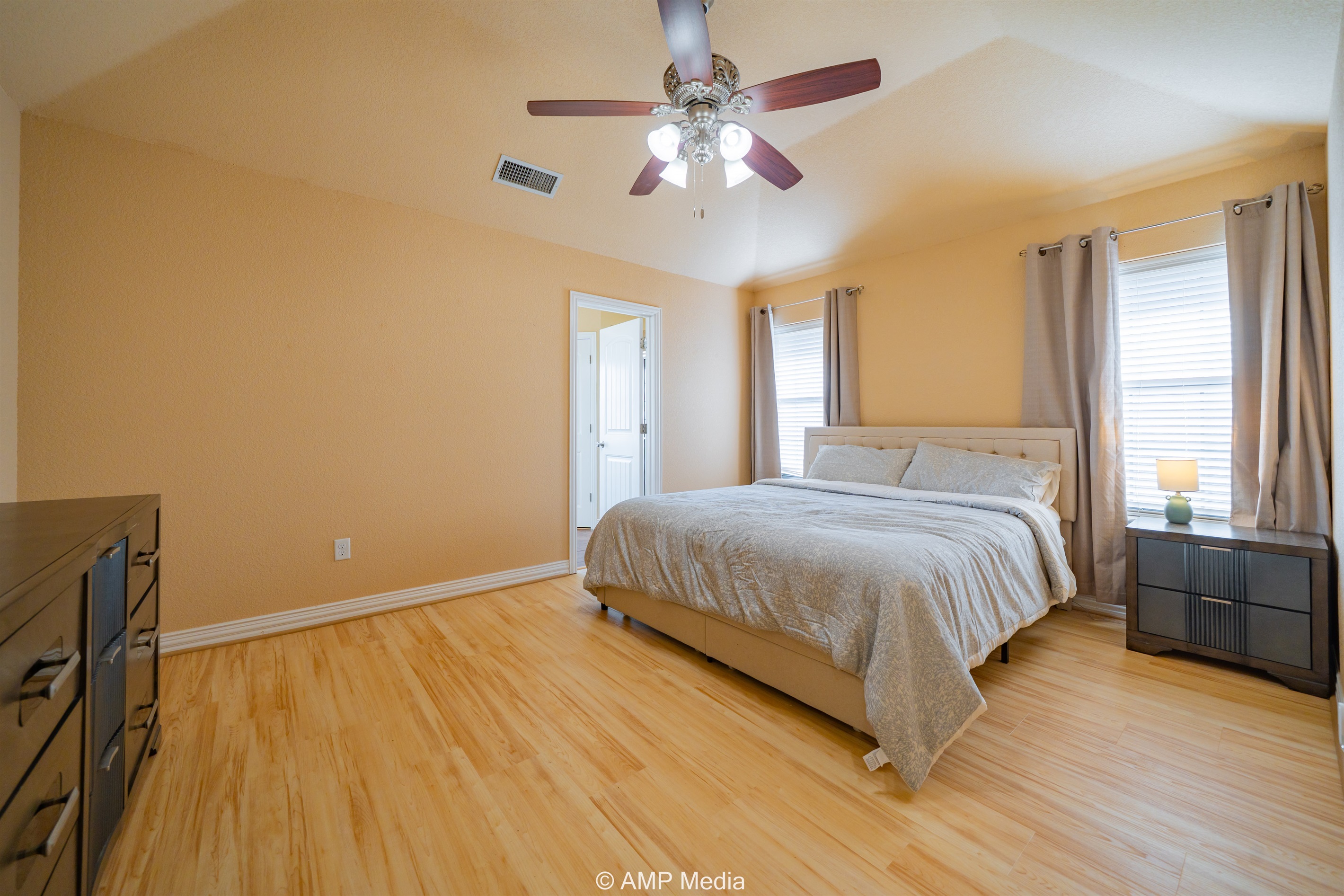 This home features three spacious bedrooms, each with gleaming hardwood floors, ceiling fans for comfort, and ample natural light. The master bedroom serves as a peaceful retreat with generous dimensions, while two additional bedrooms provide comfortable accommodations for family members or guests. All bedrooms feature quality window treatments and plenty of closet storage.