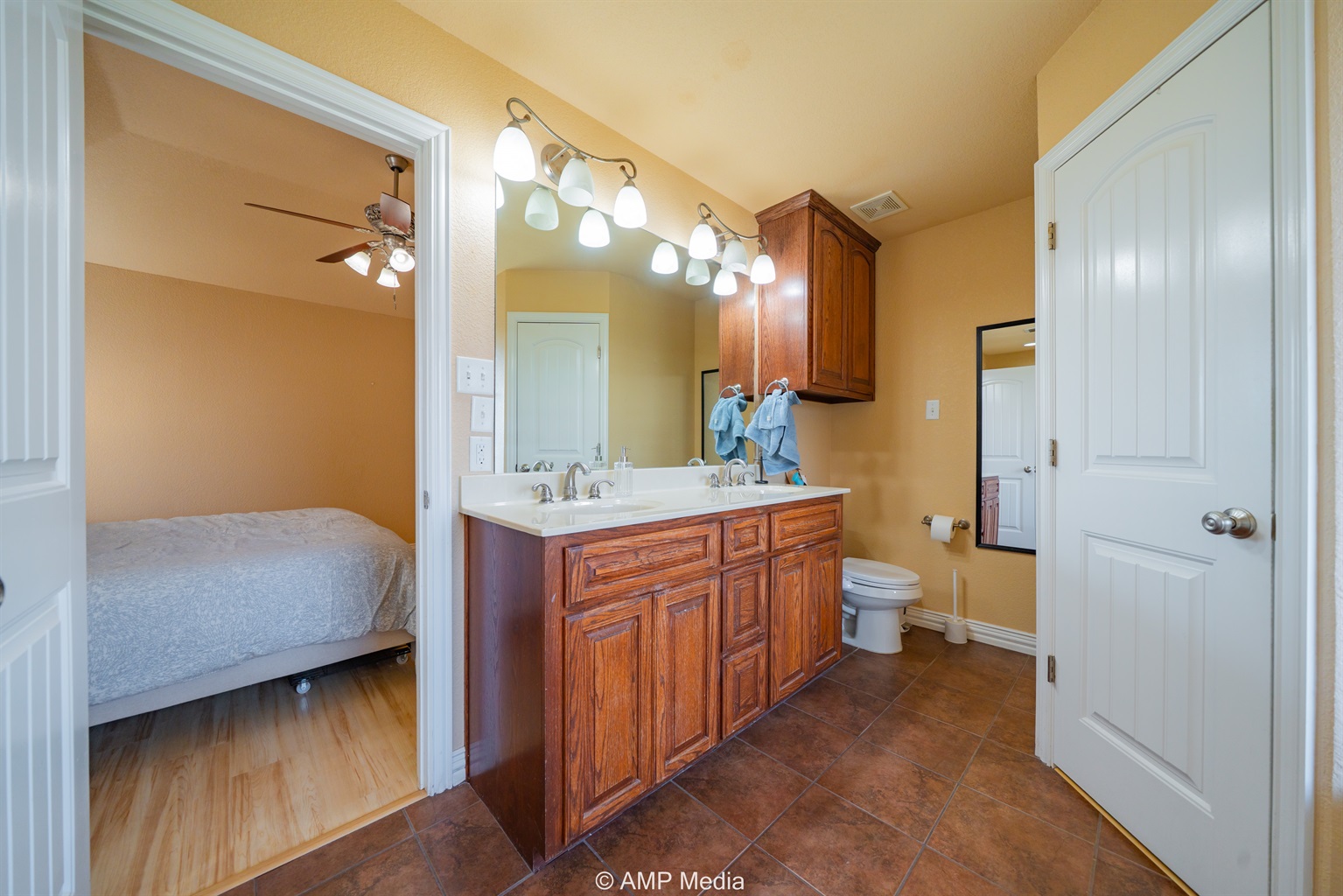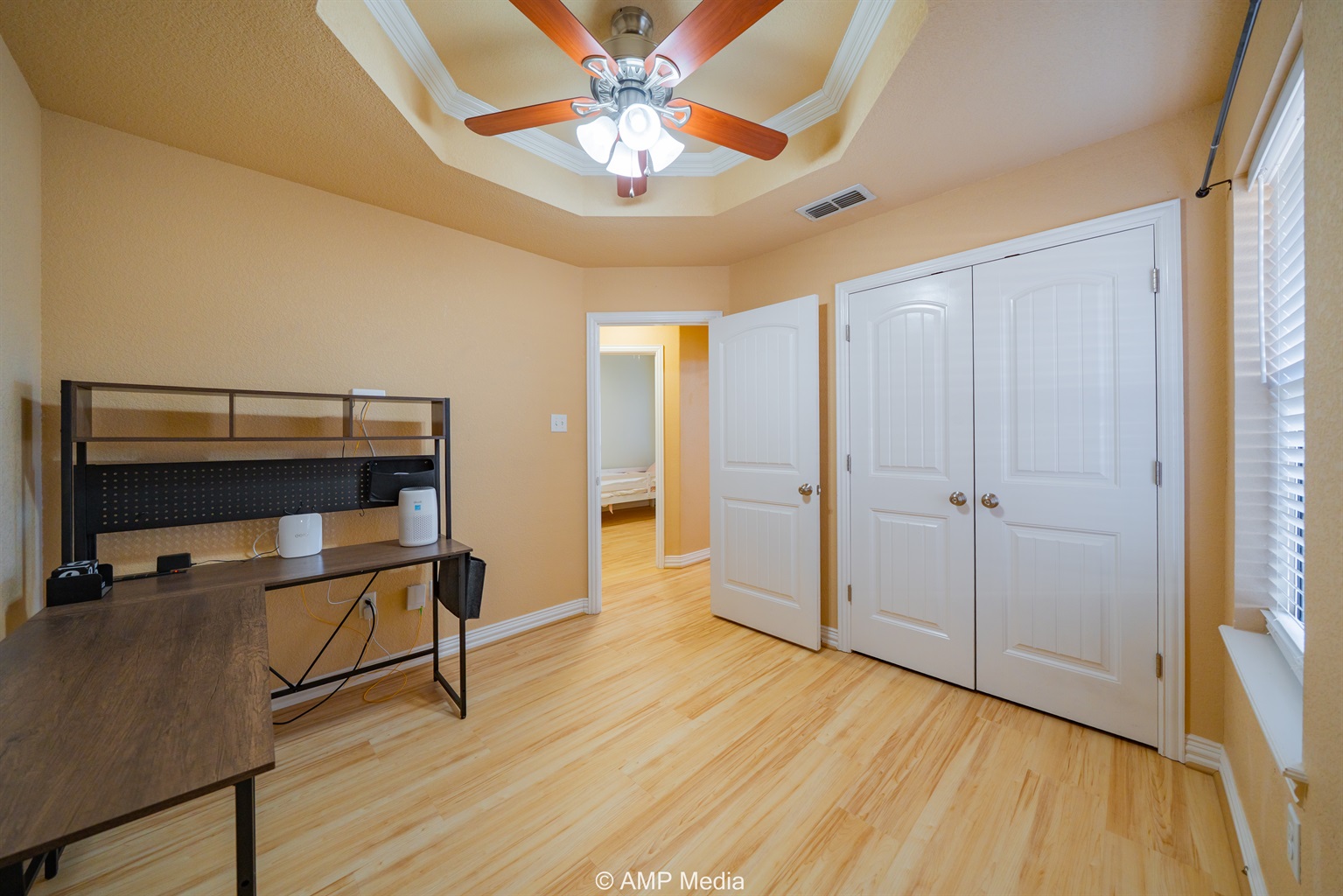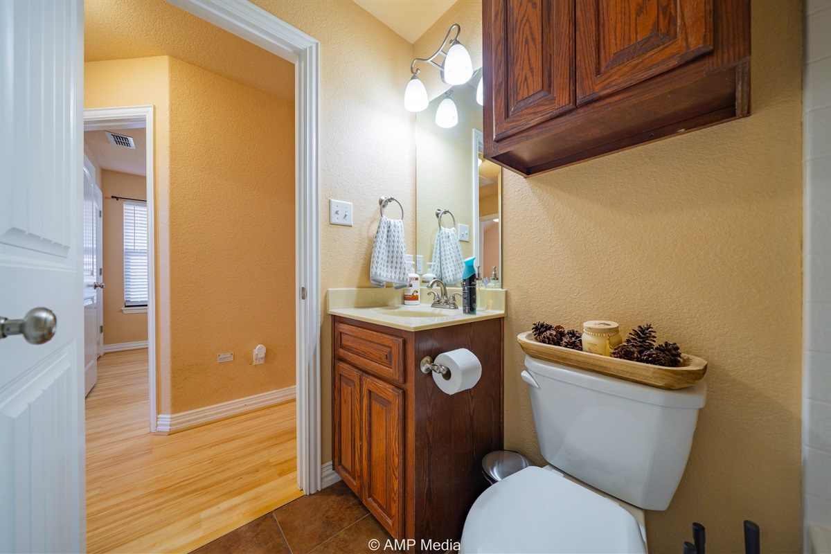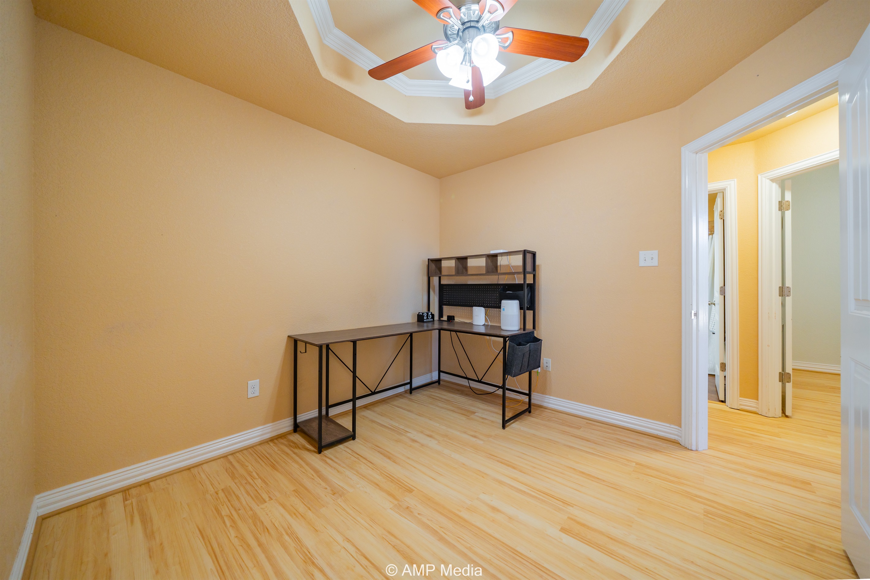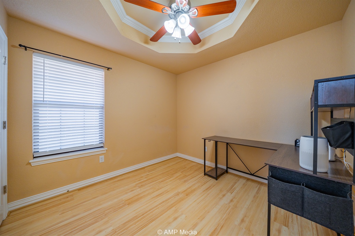 This home features three spacious bedrooms, each with gleaming hardwood floors, ceiling fans for comfort, and ample natural light. The master bedroom serves as a peaceful retreat with generous dimensions, while two additional bedrooms provide comfortable accommodations for family members or guests. All bedrooms feature quality window treatments and plenty of closet storage.